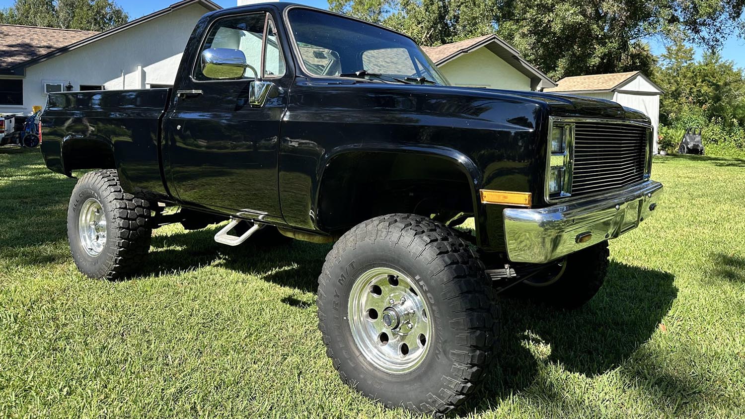 383-Powered 1985 Chevrolet K10 Pickup finished in black with a lifted stance, upgraded suspension, and stroker V8 performance. This classic 4×4 combines rugged styling, modern upgrades, and a powerful 383ci stroker V8 linked to a four-speed automatic transmission.