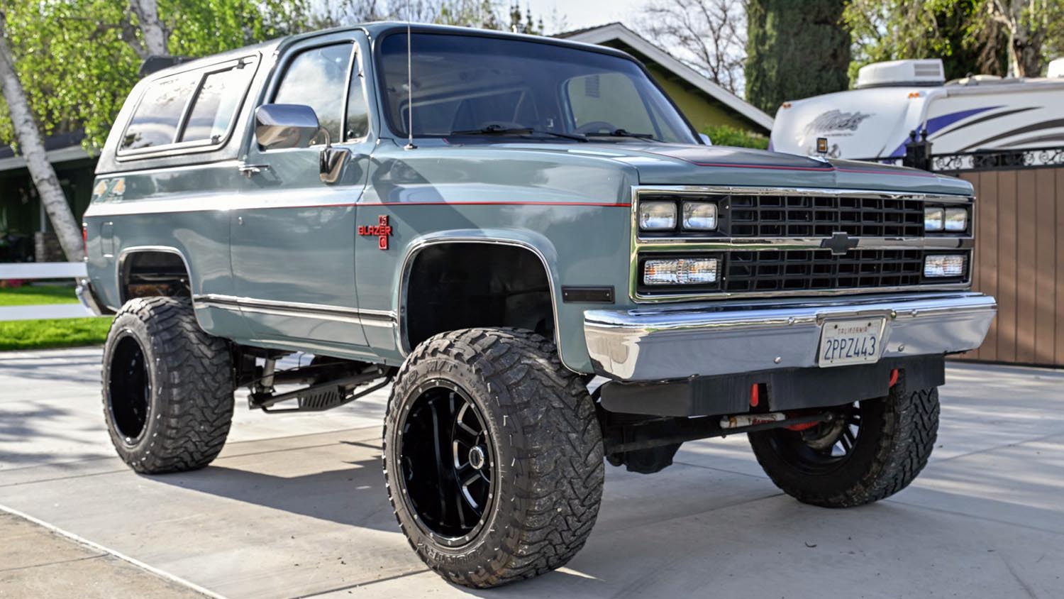 Refinished in blue with a Rough Country lift and 35-inch Toyo tires, this 1990 Chevrolet K5 Blazer Silverado features a rebuilt drivetrain, electronic fuel injection, and a modern touchscreen audio system.