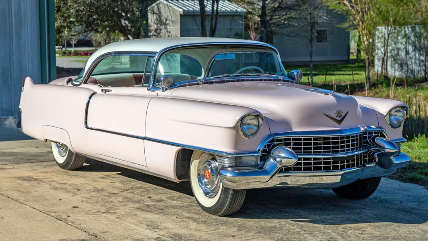 Presented in a classic pink and white scheme, this 1955 Cadillac Coupe DeVille features a 331 CI V-8, air conditioning, and power steering for the ultimate mid-century cruise.