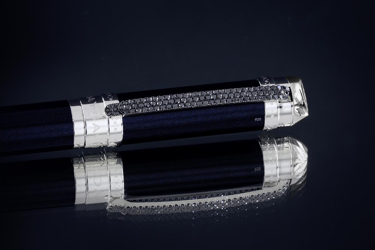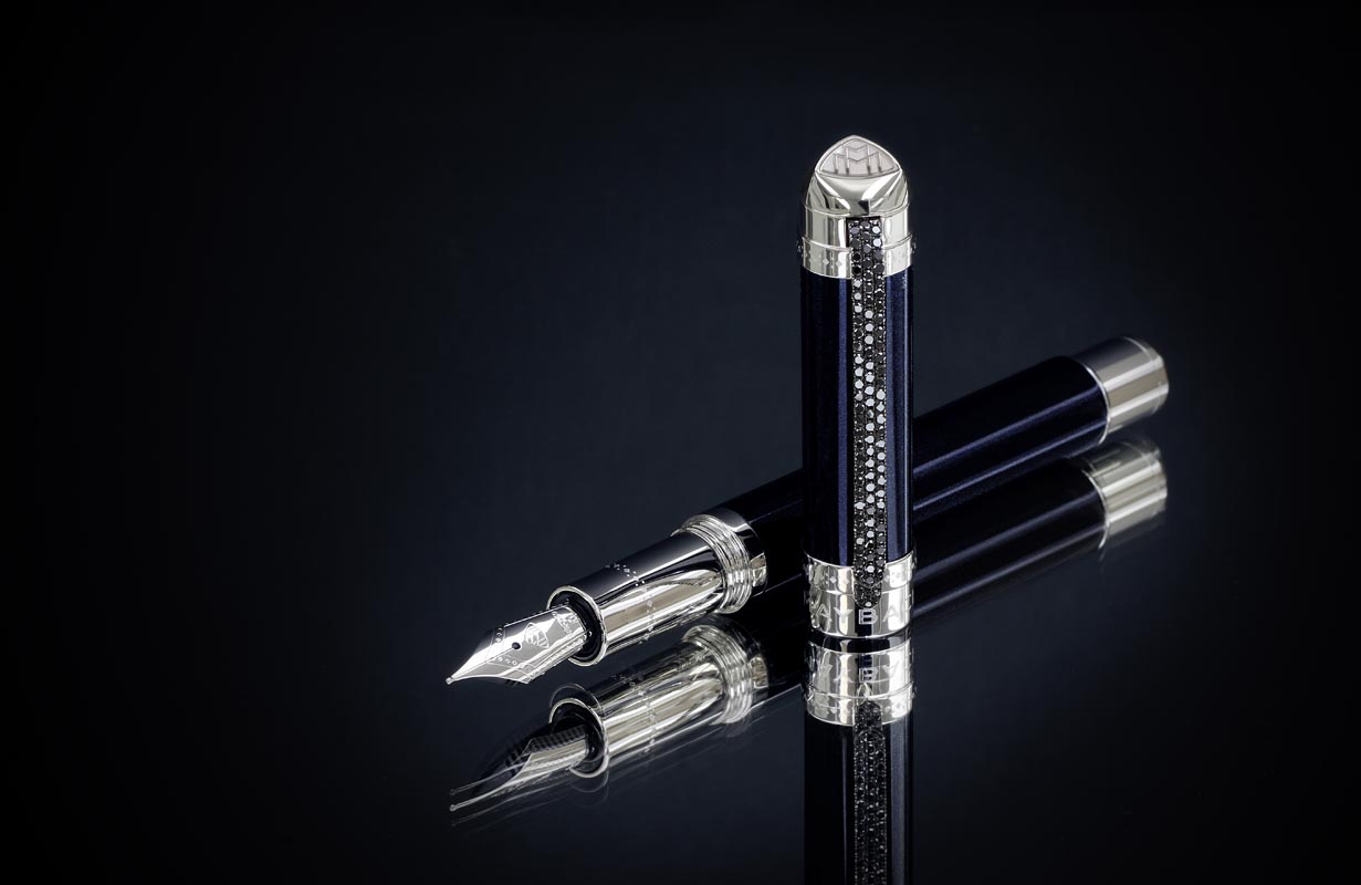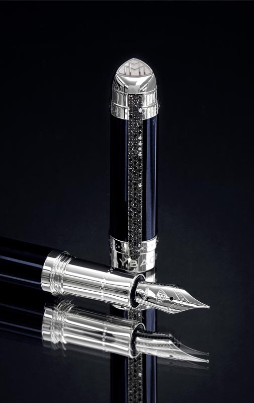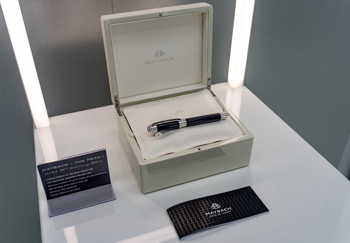 To celebrate the 100th anniversary, the Maybach The Peak collection presents a limited-edition fountain pen with an 18-carat gold nib and serial numbering in a stylish wooden gift box. The clip of the pen is set with 100 diamonds, in a choice of either black or white, the cap tip is made of mother-of-pearl, and the body is lacquered in the blue metallic shade of the “Edition 100” vehicles.