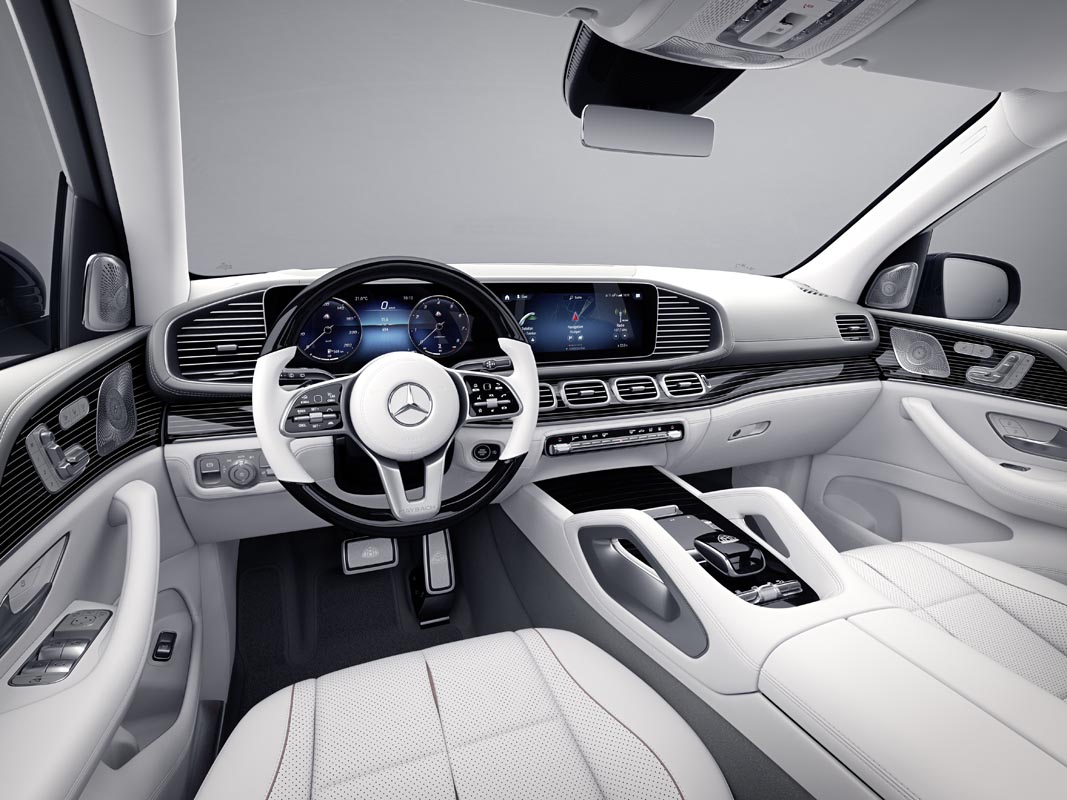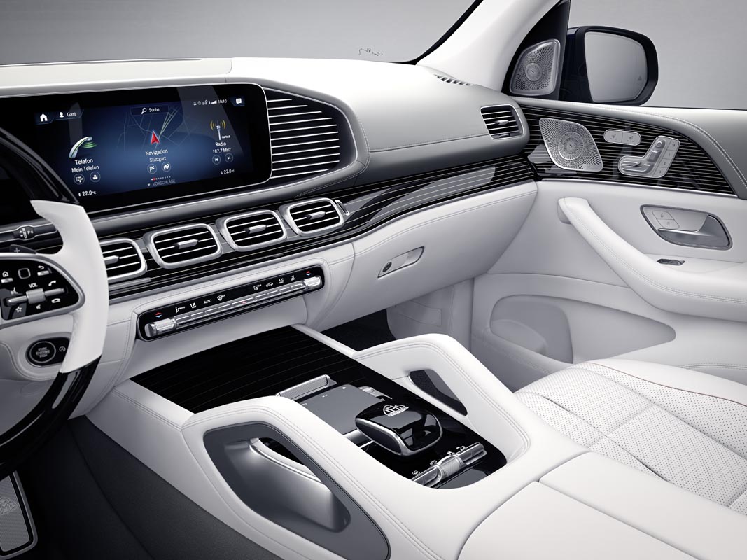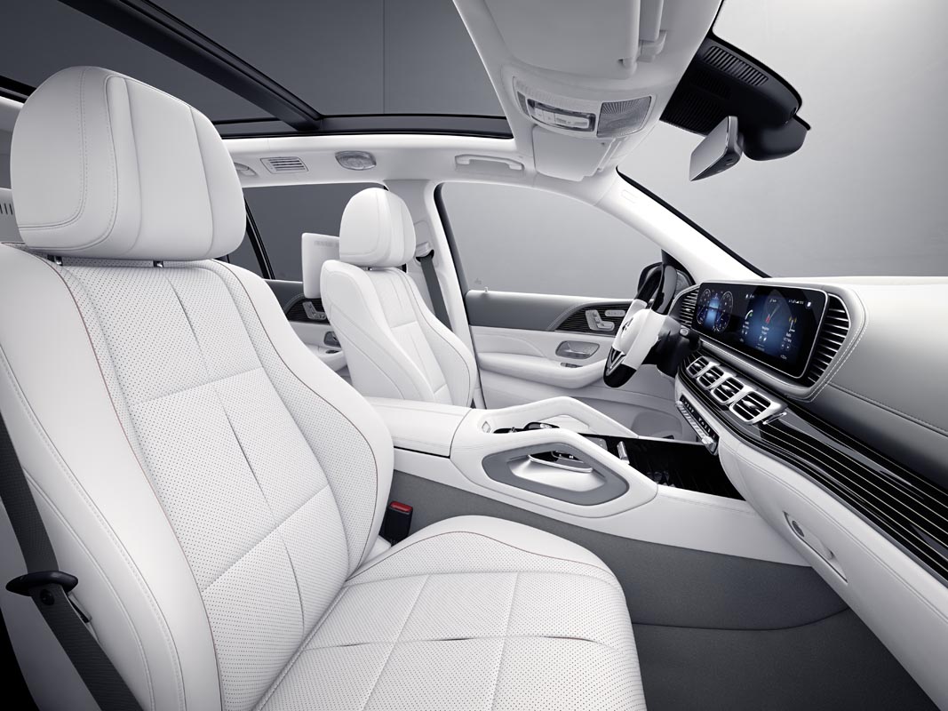 The top-class GLS SUV with a V8 engine and 557 hp (NEDC combined fuel consumption: 12.0 l/100 km | combined CO2 emissions: 275 g/km)[1] combines a sporty appearance with the luxury of a saloon: it is 33 centimetres higher than the classic saloon, offers a uniquely generous interior with 1.10 metres of legroom and air suspension. The interior is soundproofed and adorned with the finest leather. Electrically extendable running boards ensure maximum comfort when getting in and out.