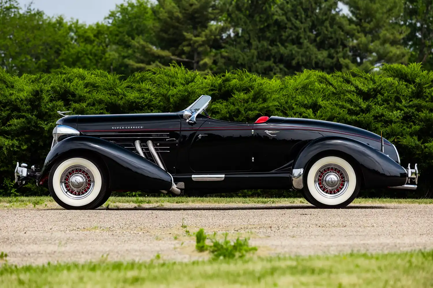 Finished in deep black with a red interior, the Auburn mixes Art Deco grace with purposeful elegance. Chrome wire wheels and whitewall tires complete the look. Add a driver’s spotlight and golf club door, and suddenly it’s not just a car, it’s a lifestyle.