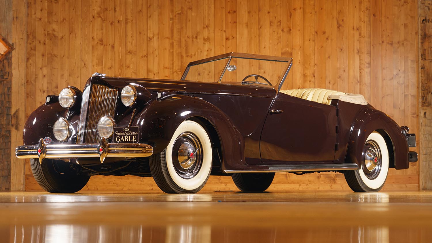 Howard Darrin famously created the first Packard Darrin roadster for actor Dick Powell. That project utilized a modified business coupe chassis to create a rakish, hand-built look. Darrin learned vital lessons during that initial build which he applied to the Gable car. This 1938 Packard 1601 Eight Convertible Victoria was the last to use a traditional ash-framed cowl. Later production models shifted to a cast aluminum cowl that was not yet ready for Gable. This early construction method makes the Gable car a unique transitional piece in the Darrin legacy. The hood line notably extends to within a half-inch of the door opening for a dramatic profile.