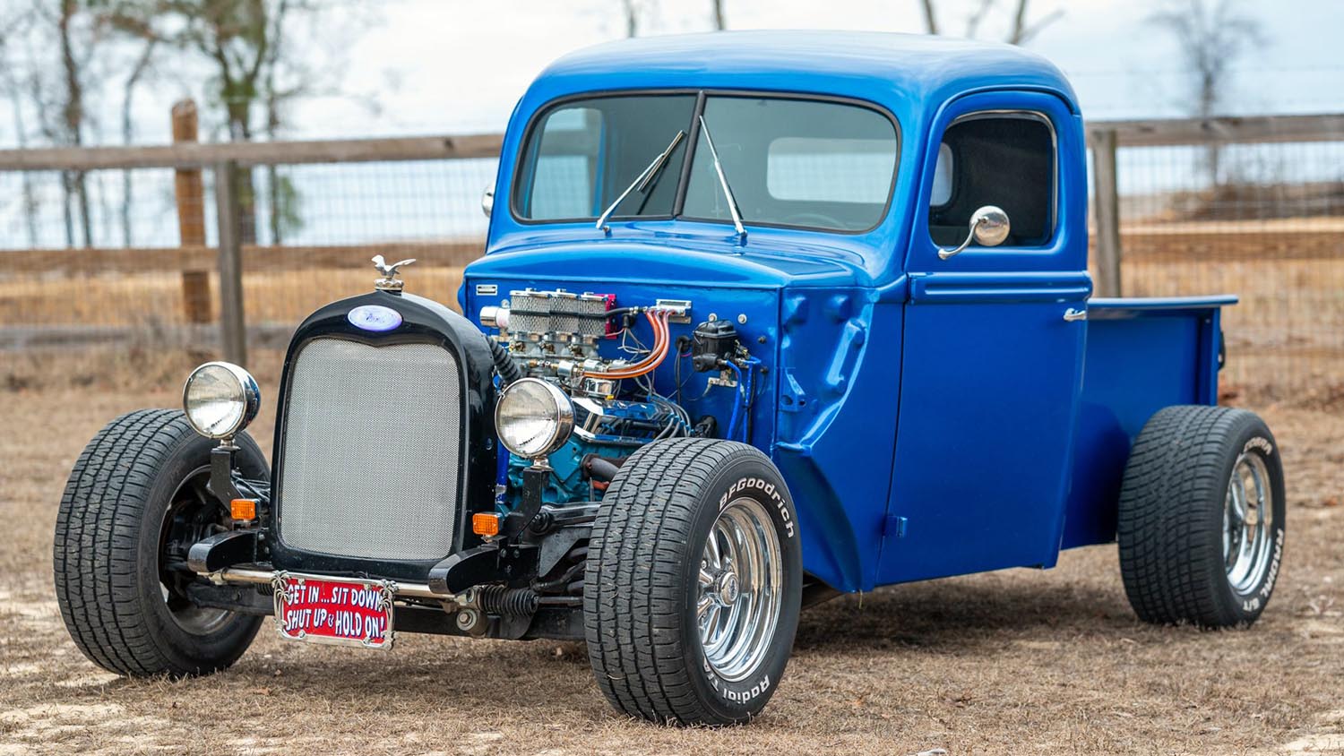 This build sits on a set of iconic 15-inch Cragar S/S wheels, which provide the perfect period-correct shine against the metallic blue paint. These wheels are wrapped in recently mounted BFGoodrich rubber, featuring a staggered fitment that emphasizes the truck’s rake. The wide rear tires help fill out the space beneath the custom bed, while the narrower fronts assist with steering precision. Every enthusiast recognizes the Cragar five-spoke design as a staple of the custom car scene, and they fit this pickup perfectly. Because the tires are fresh, the next owner can focus on cruising rather than immediate maintenance. The wheel and tire combination is often the soul of a street rod, and this Ford wears its choices with pride. It is a setup that looks just as good at a standstill as it does on the highway.
