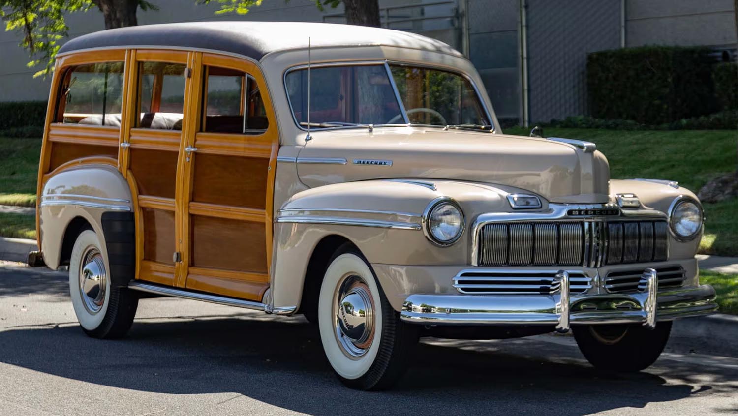 The silhouette of this Mercury is an architectural marvel, blending rounded sheet metal with intricate woodworking. Its Taffy Brown paint provides a warm, period-correct backdrop for the star of the show: the rare Birdseye Maple wood trim. This wood has been meticulously restored, showcasing the unique “eyes” in the grain that make this specific wagon more desirable than standard maple versions. The functional exterior details include a classic wood split tailgate, sliding rear windows, and 15-inch steel wheels adorned with chrome hubcaps. Coker Classic wide whitewall tires complete the nostalgic look, ensuring the wagon maintains its dignified post-war stance.