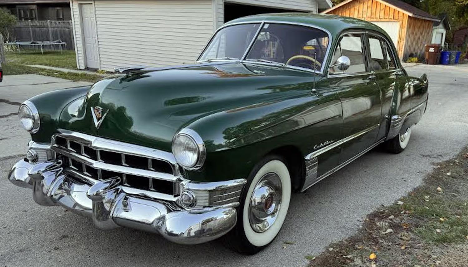 The sedan wears its original Green finish, complemented by chrome bumpers and bright trim. Full-size wheel covers and wide whitewall tires emphasize its period style. Fender skirts complete the look, reinforcing Cadillac’s reputation for elegance and presence.