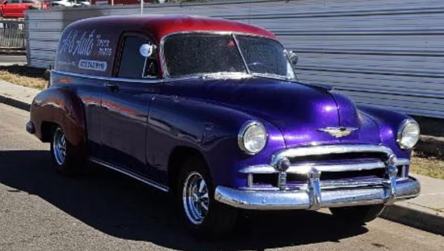Visually striking, the exterior is finished in a daring two-tone Purple and Red paint scheme that highlights the sweeping fenders and rounded roofline typical of early fifties Chevrolets. The front fascia remains true to its heritage with a bright chrome grille and matching front bumper, while the rear features a color-matched painted bumper for a streamlined look. Dual side mirrors and a set of classic Cragar SS wheels complete the period-correct street rod aesthetic. This combination of bold colors and shimmering brightwork ensures the vehicle stands out in any classic car gathering or promotional event.