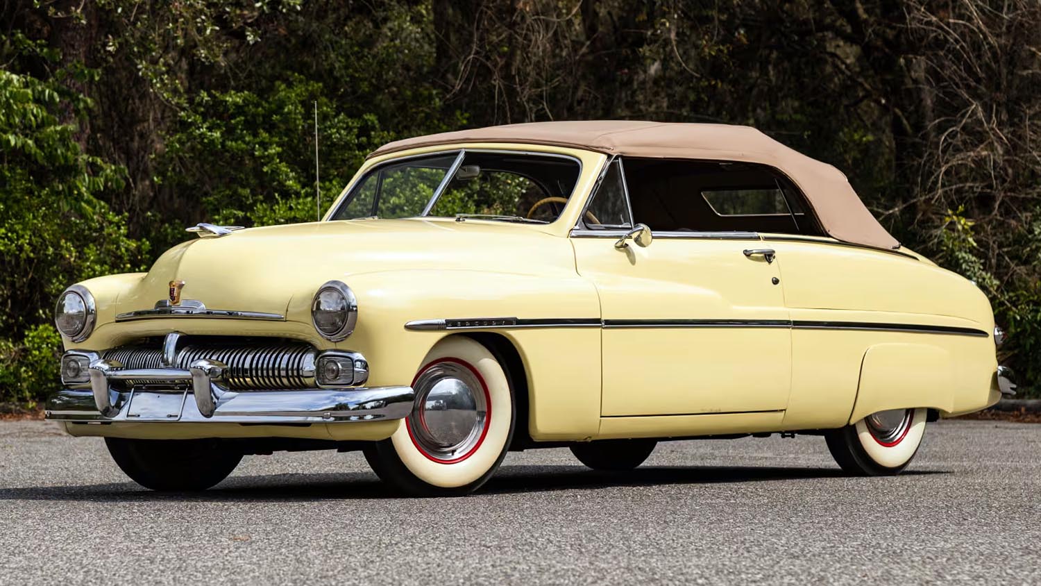 The 1950 Mercury Convertible represents a high-water mark for mid-century American automotive design and post-war luxury. As the most expensive model in the lineup that year, it commanded a premium price of $3,412 at dealerships. This specific example is one of only 8,341 Model OCM units produced during the 1950 model year run. Finished in a stunning Mirada Yellow with a Tan convertible top, it captures the optimistic spirit of its era perfectly. The vehicle sits on red steel wheels adorned with wide Whitewall tires, emphasizing its classic 1950s silhouette. Its presence on the road remains undeniable, bridging the gap between utilitarian transportation and high-status luxury cruising. For the collector, this Mercury offers a rare combination of documented rarity and striking period-correct aesthetics. It continues to be a favorite among enthusiasts who appreciate the heavy chrome and flowing lines of the fifties.