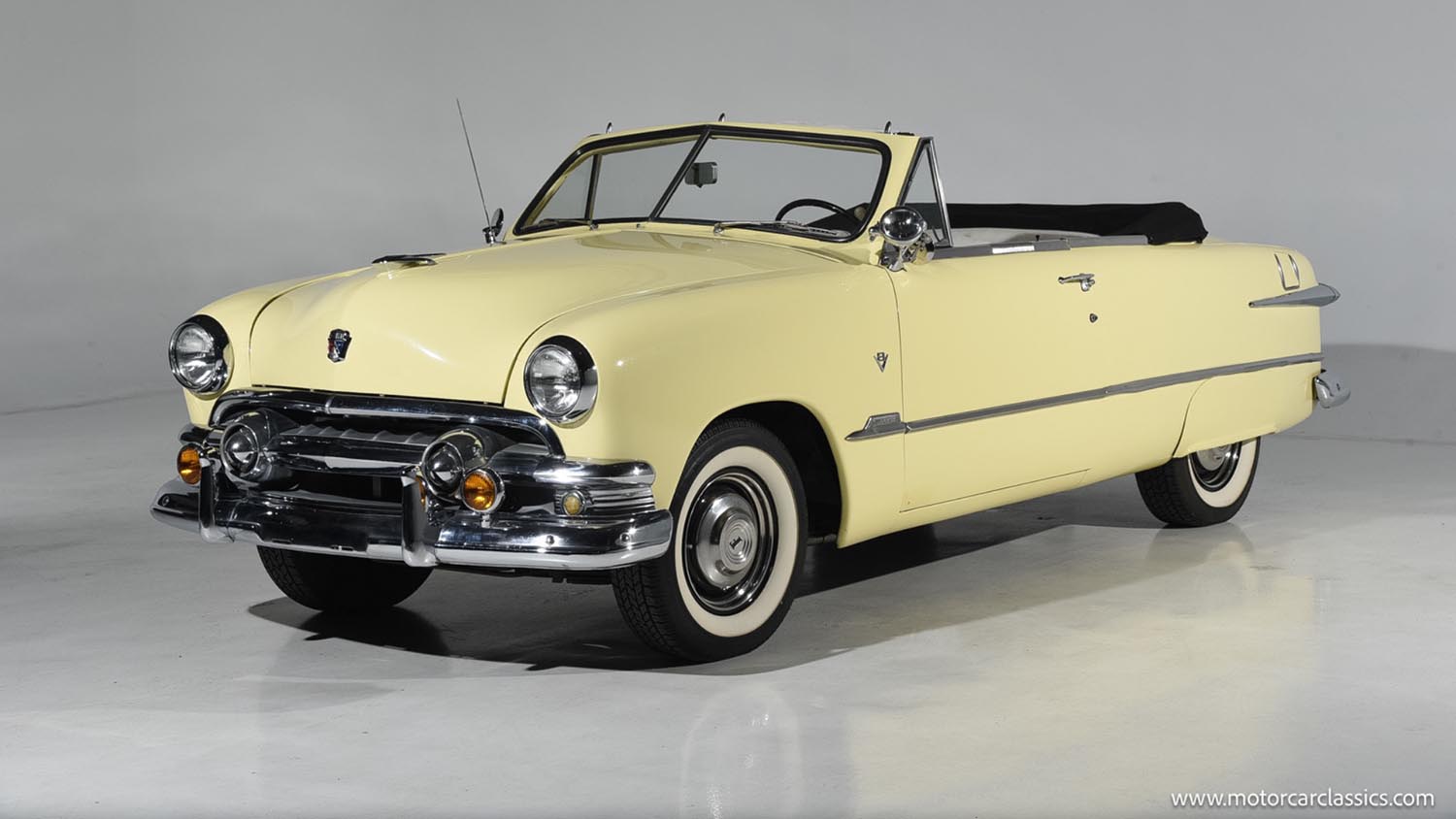 The exterior of this 1951 Ford Deluxe Custom Convertible is finished in a period-correct pale yellow, a hue that perfectly complements the car’s soft, rounded proportions. It features the distinctive 1951-only front end, characterized by two chrome bullets housed within the grille bar and a restyled hood ornament. A high-contrast black power-folding soft top provides a sharp visual break from the light bodywork, while rear fender skirts enhance the streamlined, low-slung look. The chrome brightwork, from the wraparound bumpers to the side trim, remains prominent, and the car sits traditionally on steel wheels with polished hubcaps and wide whitewall tires.