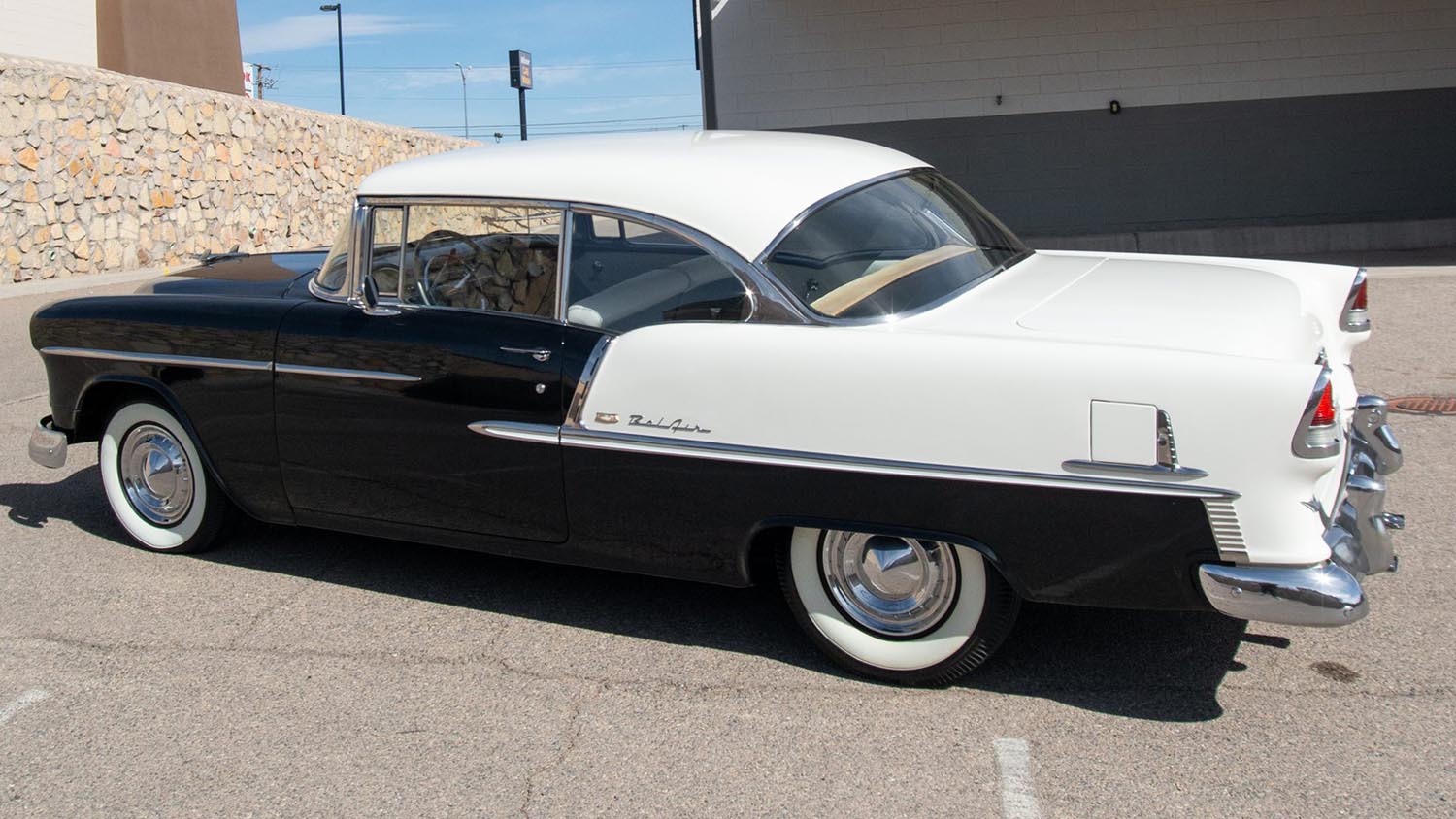 The 1955 Bel Air introduced a completely new silhouette for Chevrolet. Its two-door hardtop body removed the traditional B-pillar, creating a long uninterrupted roofline that emphasized openness and style. Finished in black and white today, the car originally left the factory in India Ivory and Onyx Black, one of the most recognizable two-tone combinations of the era.