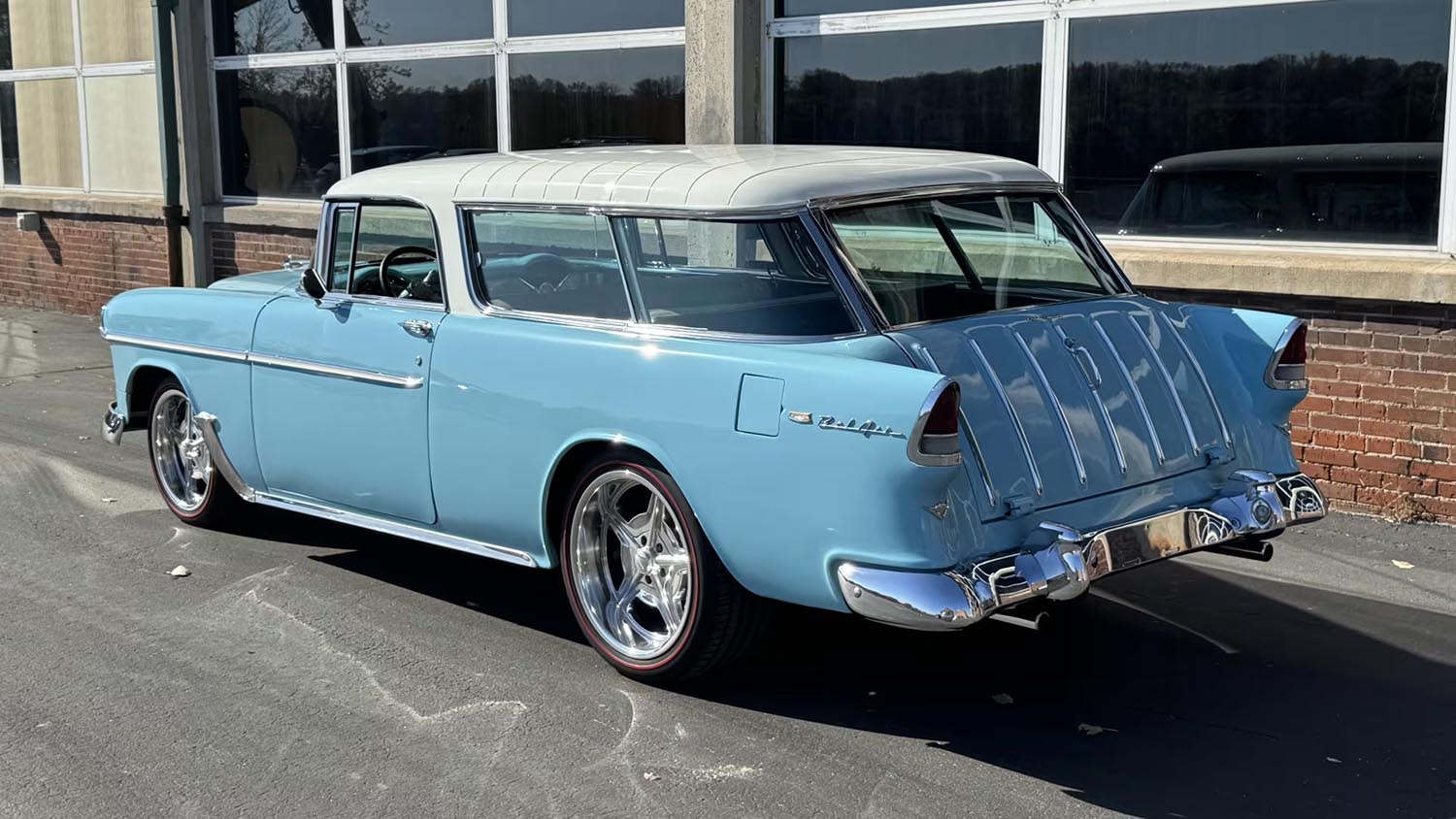 Under the hood, this restomod Nomad receives a significant and reliable upgrade. It is powered by an LSI 5.7L V-8 engine, a robust and proven performer. This power is managed by an automatic transmission, making for smooth shifts and effortless acceleration. The entire package sits on staggered 18 and 20-inch Billet Specialties wheels. These wheels are fitted with performance Redline tires, completing the aggressive yet classic stance.