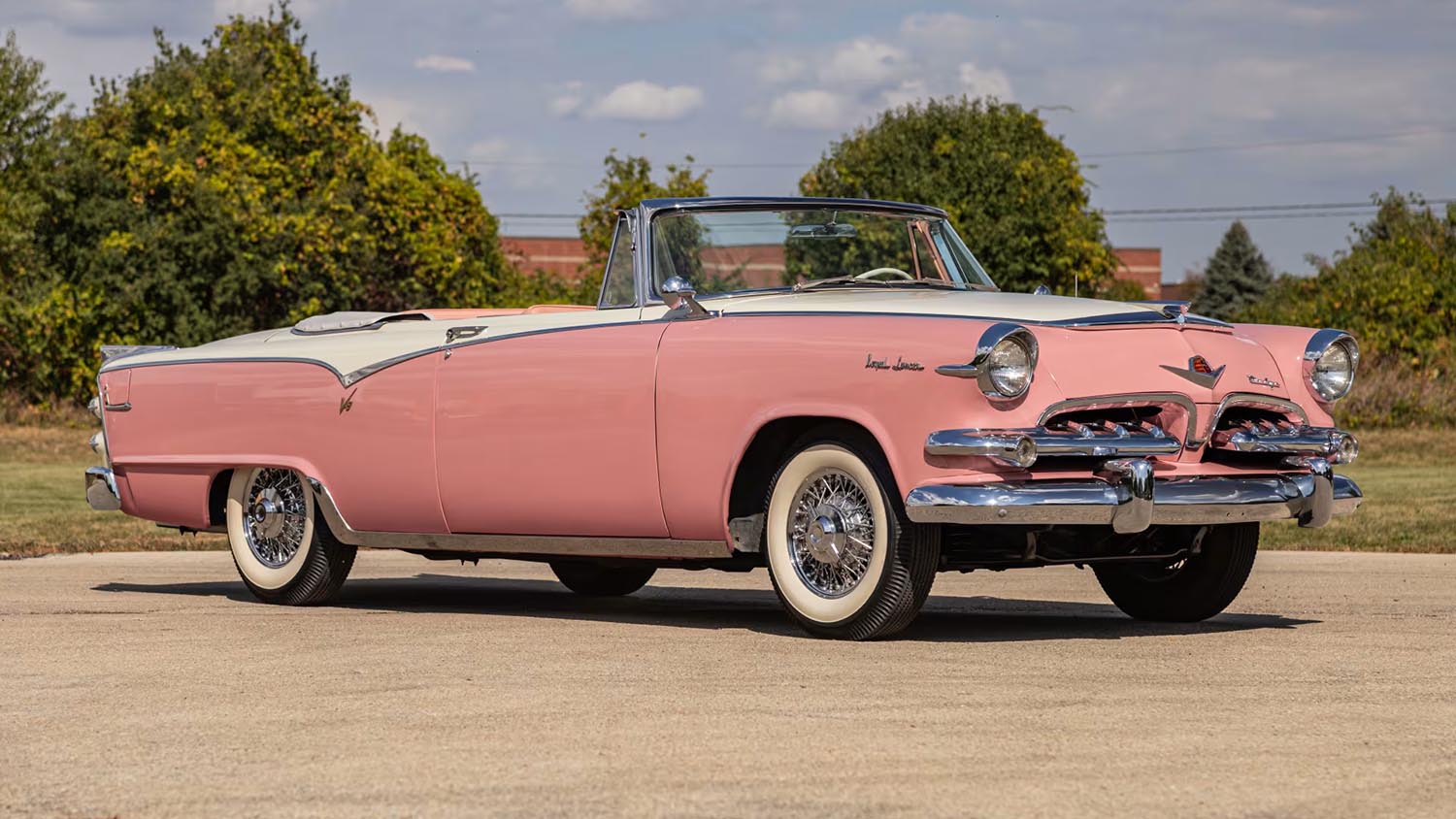 The 1955 Dodge Royal Lancer Convertible is a rare and visually spectacular car that perfectly embodies the start of the horsepower and design wars of the mid-1950s. Being one of just 3,302 units built, it stands out with its gorgeous Heather Rose and Sapphire White paint. This top-of-the-line convertible boasts the renowned 270 Red Ram Hemi engine and a host of luxury options. Lot V167 is a prime example of Dodge’s successful “Forward Look” era and a highly desirable prize for any serious collector.