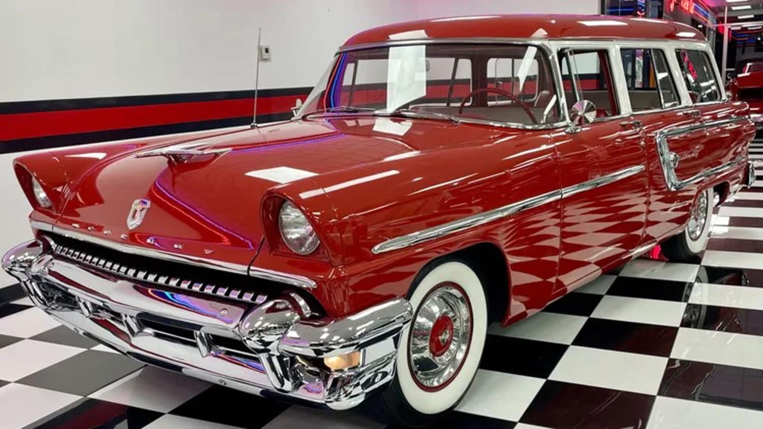 In summary, this 1955 Mercury Custom Wagon is a spectacular piece of American automotive history. It showcases the sought-after Carmen Red and Alaska White two-tone finish. The 292 CI Thunderbird Y-block V-8 and Merc-O-Matic transmission ensure a comfortable ride. Offering rare nine-passenger capacity and correct interior trim, this wagon is a charming and distinctive collector vehicle.