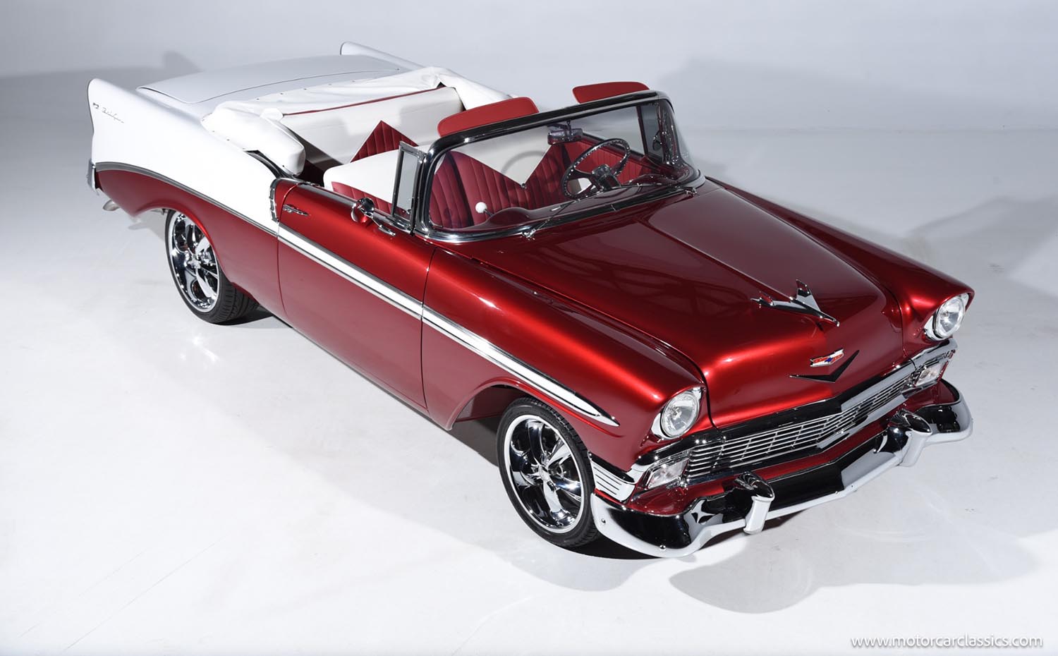In summary, this 1956 Chevrolet Bel Air Convertible is a meticulously executed restomod build. It features the powerful, fuel-injected LT1 350 V-8 and a modern 5-speed manual transmission. The custom two-tone Ruby Red paint and Ultra-leather interior are stunning. With modernized features like four-wheel disc brakes, Vintage air, and digital gauges, this Bel Air provides an exhilarating and reliable experience.