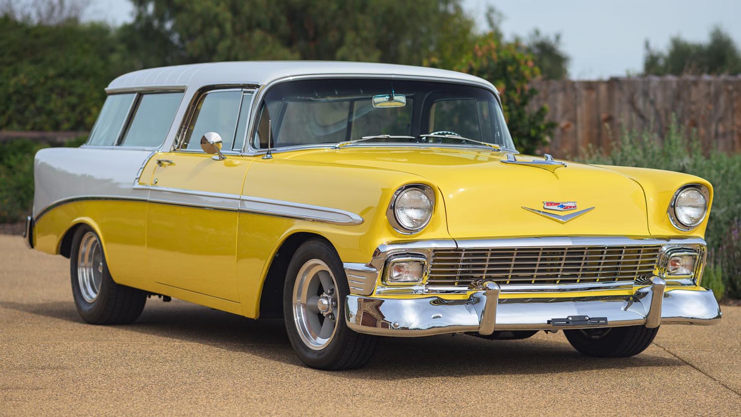 The two-tone Canary Yellow and white finish accentuates the Nomad’s signature slanted B-pillars and wrap-around rear glass. Every piece of chrome trim was addressed during the rebuild, including the hooded headlights and the distinctive fuel filler hidden above the left taillight. Consequently, the car maintains its factory charm while looking significantly more polished than a standard original example.