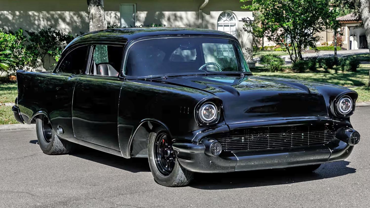 The exterior of this 1957 Chevrolet 210 Sedan is a masterclass in the “murdered-out” aesthetic, finished in deep, monochromatic black. Custom bodywork includes shaved trim, doors, decklid, and hood for a completely smooth and aerodynamic profile. All remaining brightwork has been powder-coated black to eliminate any glint of traditional chrome from the body. Hideaway details and a custom core support show the level of attention paid during the multi-year build process. The car sits low over its wheels, projecting a predatory look that perfectly justifies its Sinister nickname. This minimalist approach highlights the iconic fins and lines of the 1957 model year in a fresh, intimidating way.