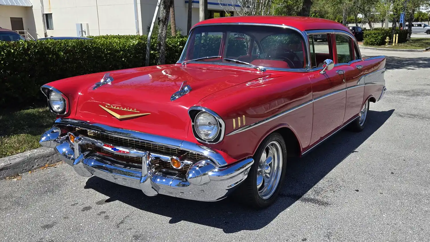 The 1957 Chevrolet Bel Air is an icon of American automotive design, representing the pinnacle of style and optimism of its era. This particular Bel Air Sedan, scheduled to cross the block on Thursday, July 10th at the Florida Summer Special 2025 event, has been beautifully restored and thoughtfully upgraded for both classic appeal and modern comfort. With its vibrant red exterior and custom two-tone red and white interior, this Bel Air is sure to turn heads wherever it goes.