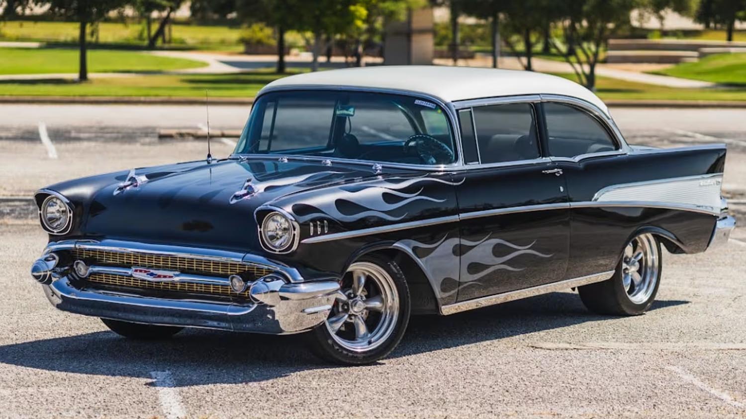 The visual character of this Bel Air is defined by its classic two-tone Black and White paintwork, uniquely customized with silver painted flames that hint at the aggression under the hood. It maintains the legendary 1957 silhouette while sitting purposefully over a set of polished American Racing wheels. The exterior is further distinguished by a functional stance, achieved through a new tubular front suspension and Alston rear ladder bars. Every piece of trim and glass remains faithful to the original design, yet the subtle additions of a performance-tuned exhaust and a lowered center of gravity give the car a menacing, ready-to-race presence.