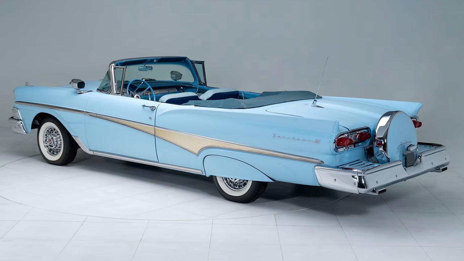 The convertible body is finished in a beautiful Azure Blue paint, providing a perfect backdrop for the car’s extensive chrome trim. The quality of the previous frame-off restoration is evident throughout the flawless exterior panels. A Dark Blue Haartz soft top provides excellent contrast and weather protection. The power top mechanism makes opening and closing the roof an effortless operation. This 1958 Ford Fairlane Sunliner is heavily adorned with period options. These additions include spotlights with integrated mirrors and accessory fender skirts. A classic Continental kit is mounted at the rear, extending the car’s already impressive length.