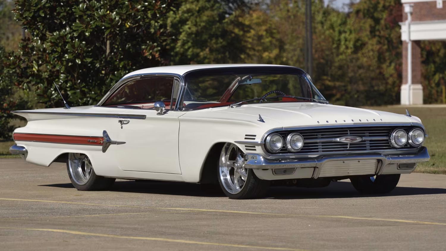 The Impala’s body is finished in White, complemented by factory-style Red and White upholstery inside. Billet Specialties wheels add a modern touch, while aluminum engine bay finishing panels highlight attention to detail. The hardtop design preserves the classic silhouette.