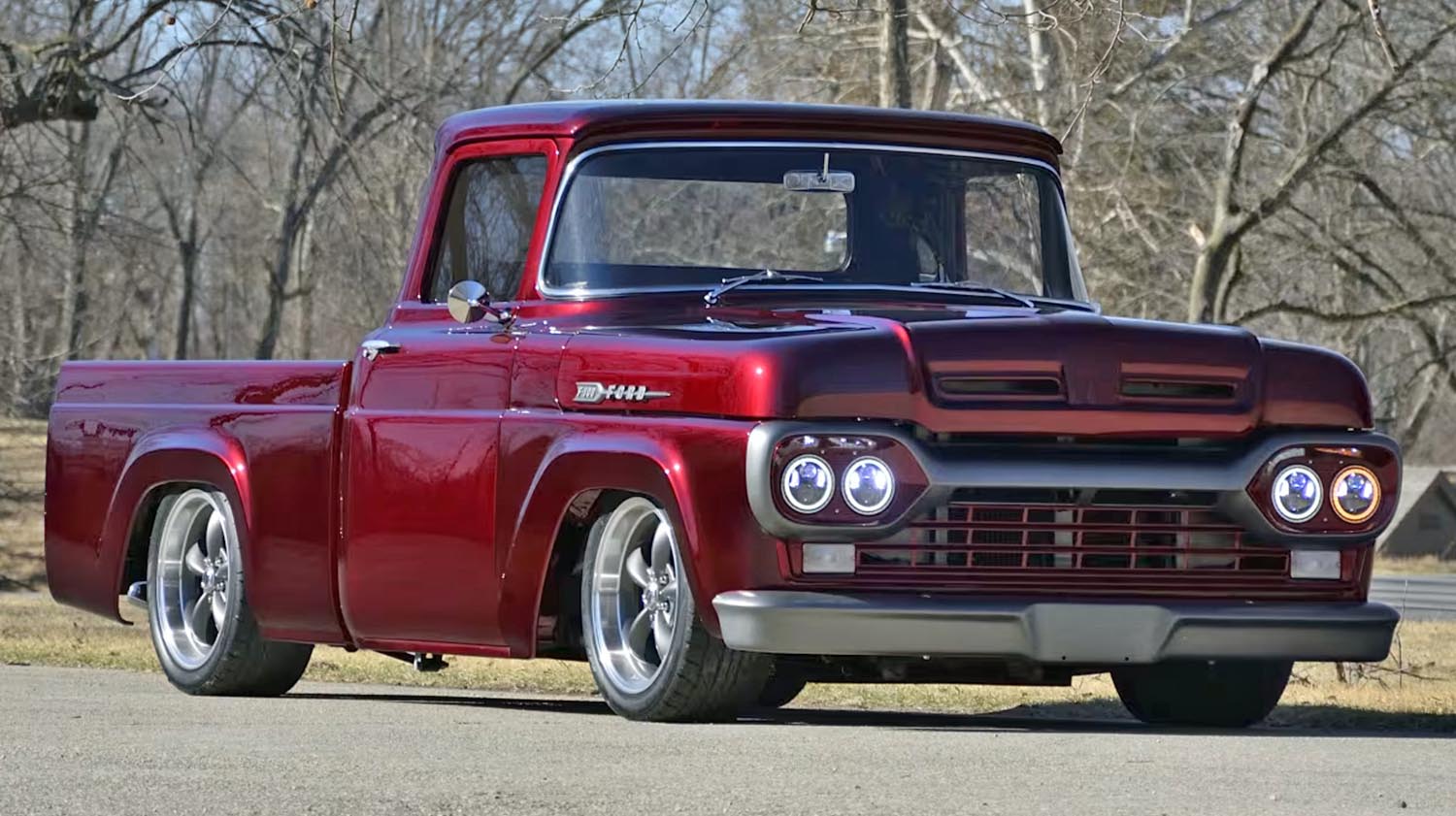 Finished in a striking Cherry Candy, the exterior of this 1960 Ford F-100 Custom Pickup is a masterclass in metal fabrication. The builders louvered and modified the hood, deleted the cowl vent, and arched the doors to fit one-piece gray tinted glass. A tucked and lowered front bumper provides a more aggressive stance, while the rear features a custom pan with a recessed license plate and Cadillac tail lights. Widened wheel tubs house 18-inch American Racing wheels wrapped in Nitto 555 tires, creating a powerful profile that remains clean thanks to a custom tailgate with hidden hinges and Bearclaw latches.