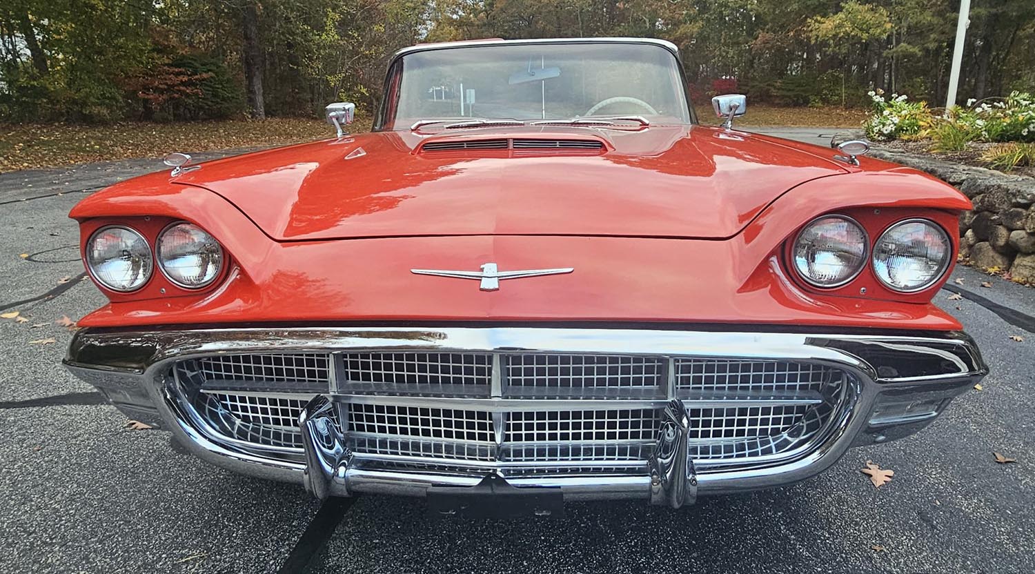 Delivered from the factory in Monte Carlo Red, this Thunderbird was repainted about three decades ago and still shines with period flair. The car carries a white power-retractable top, rear fender skirts, dual mirrors, and chrome details that reflect the confident design language of late-1950s Ford styling.