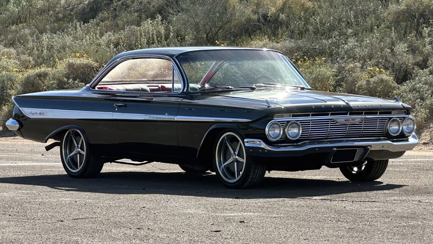 The 1961 Chevrolet Impala Bubble Top remains one of the most recognizable silhouettes in American automotive history. This specific example, finished in deep Tuxedo Black, underwent a comprehensive restoration to blend classic aesthetics with improved road manners. Its thin pillars and expansive glass offer a light, airy cabin feel that defines the early sixties design language perfectly.