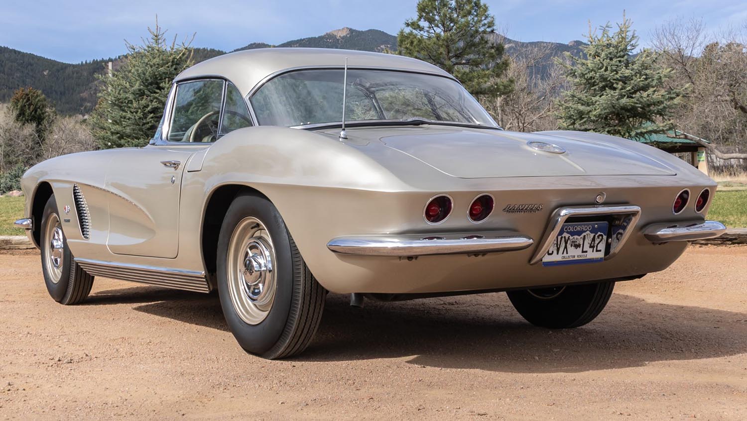 The exterior of this 1962 Chevrolet Corvette fuelie is finished in Fawn Beige, a sophisticated transition from its original Almond Beige factory hue. The silhouette remains purposeful and clean, lacking a soft top and side mirrors, details that trace back to its 1962 racing configuration. It features a body-colored hardtop, split chrome bumpers, and a genuine Daniels Chevrolet dealer badge that serves as a permanent mark of its origin. The car rides on extremely rare RPO 276 15×5.5 inch steel wheels, which were sourced in 2023 for $16,500 to ensure period-correct accuracy, and are currently wrapped in US Royal nylon bias-ply tires for an authentic vintage stance.