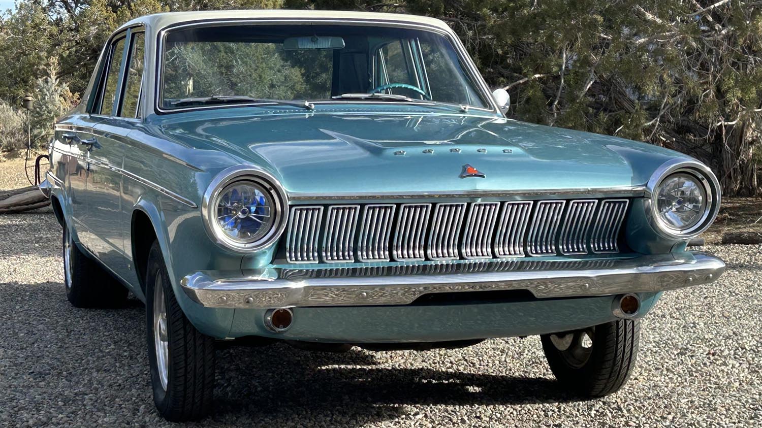 Originally finished in Turquoise Poly, the sedan was repainted in Mazda’s Mermaid Blue with a contrasting white roof. The body retains the original Dart 270 badging and side moldings. However, the rear wheel openings have been aggressively mini-tubbed to accommodate wider rear tires. Aftermarket headlamps and bright chrome bumpers add visual appeal. The car’s aggressive, lowered stance hints clearly at its mechanical capabilities. Imperfections like paint bubbling are noted on several exterior panels.