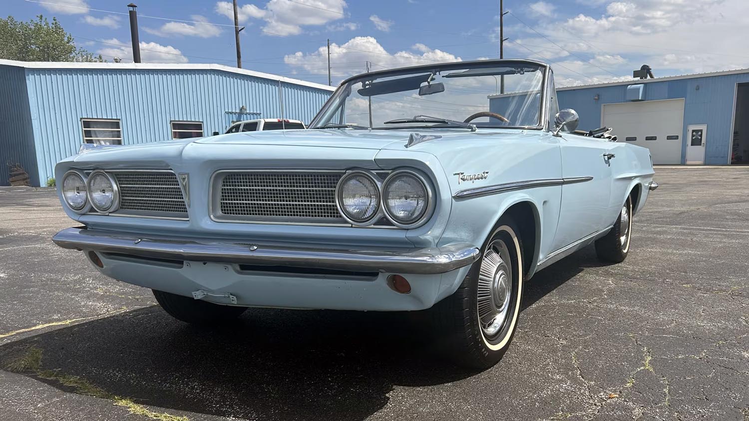 The exterior character of this Tempest is defined by its clean, linear styling and the vibrant Kimberly Blue paint that accentuates its compact but muscular proportions. A crisp white convertible top provides a striking contrast, while the original chrome bumpers maintain their factory-correct luster. The car sits on traditional wheels adorned with factory wheel covers and white stripe tires, completing the authentic 1963 aesthetic. Unlike the larger full-sized cruisers of the era, the Tempest silhouette was designed for agility and efficiency without sacrificing the bold Pontiac visual identity. Every line of the bodywork highlights the transition from the fins of the fifties to the refined slab-sided look of the sixties.