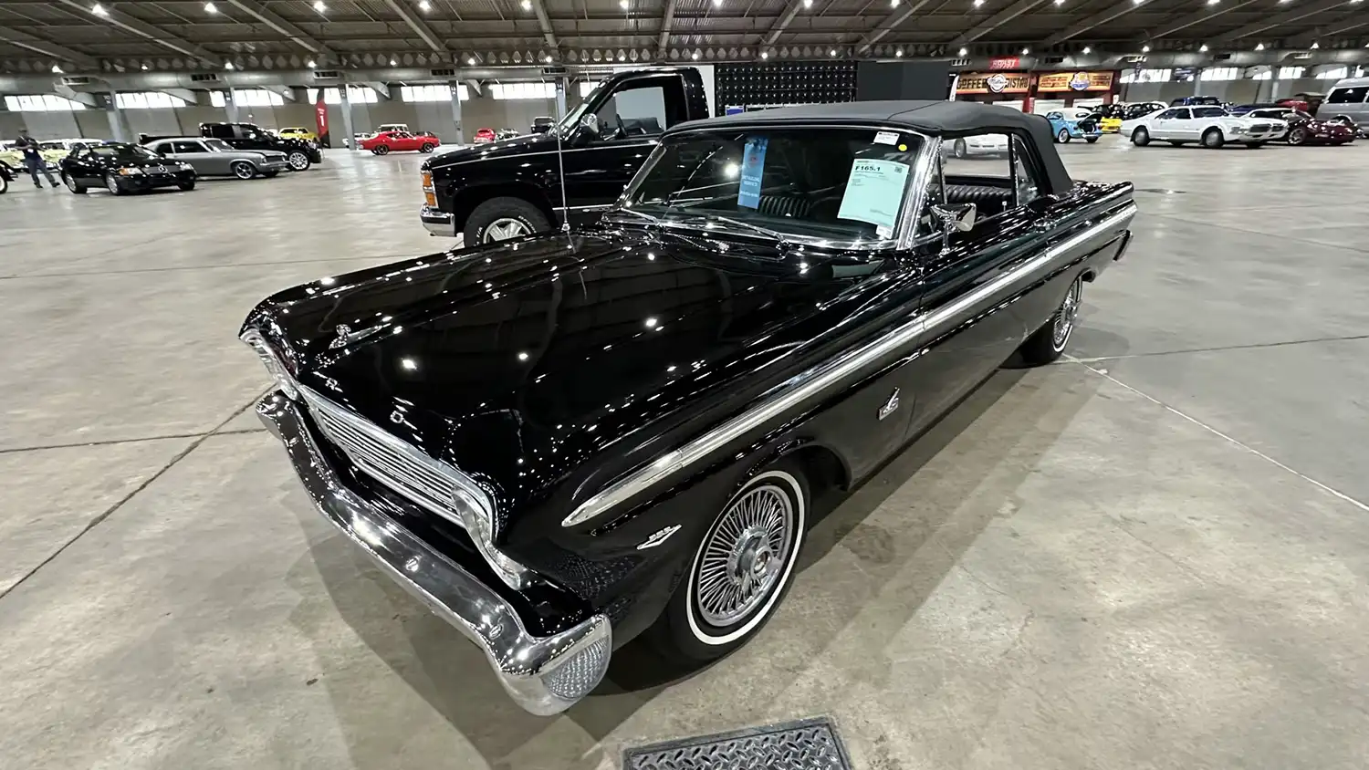 This 1965 Ford Falcon Futura showcases an incredibly sought-after “Triple Black” presentation. Its exterior is finished in deep Raven Black. This dark hue emphasizes the car’s sleek lines. The black power convertible top perfectly complements the body. It creates a cohesive and elegant profile. The black interior completes this striking motif. This monochromatic scheme exudes sophisticated style. Tinted glass adds to the car’s mystique. It also provides occupant privacy. Dual chrome mirrors enhance its classic appearance. These elements collectively contribute to its enduring appeal.