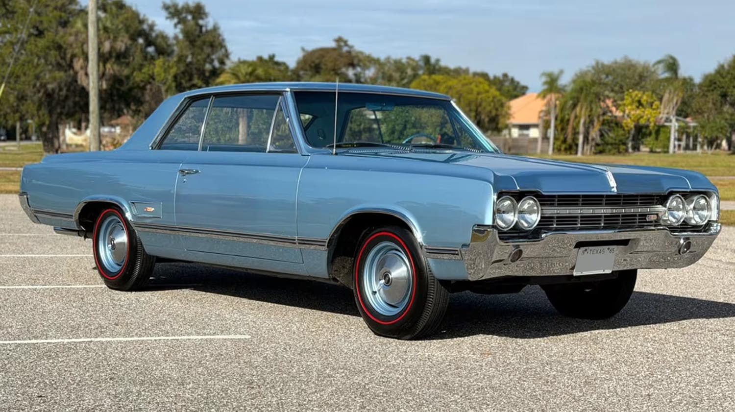 Repainted in Code D Lucerne Mist, the body reflects period-correct detail. Bright hubcaps and Redline tires accent the color-keyed steel wheels. Chrome trim and the 442 shift handle add subtle touches of distinction.