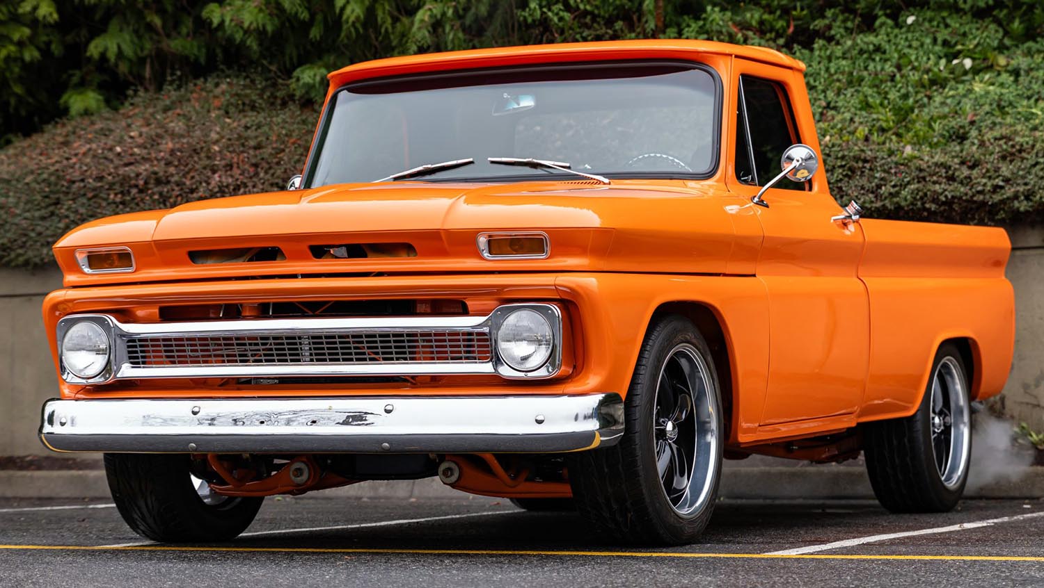 The 1966 Chevrolet C10 Fleetside sits on a modified suspension that features powder-coated orange components for a show-quality finish. It utilizes a front sway bar along with a rear trailing arm setup and a Panhard bar for improved stability. Consequently, the truck handles more like a modern vehicle than its original factory counterparts. Four-wheel disc brakes managed by an SSBC master cylinder provide reliable stopping power for the high-output stroker engine.