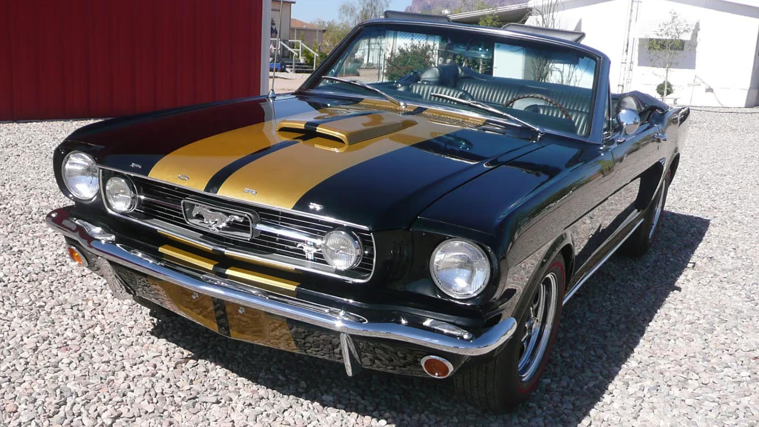 The exterior of this Mustang stands out immediately due to its striking gold G.T.350-H-style striping. These stripes run across the hood and along the lower rocker panels, contrasting beautifully against the black paint. This color combination was made famous by the “Rent-A-Racer” program, giving the car an instant pedigree. The convertible top allows for an easy transition from a closed coupe profile to an open-air experience. Chrome bumpers and polished trim pieces have been maintained to highlight the sharp lines of the 1966 body. It is a cohesive look that honors Ford’s racing history without sacrificing comfort.