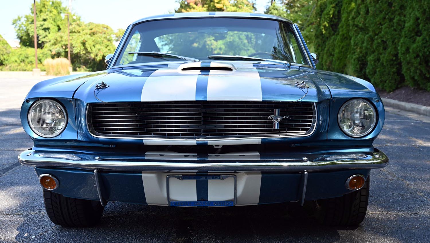 The transformation includes side scoops and a functional hood scoop that mimic the original Shelby profile. Rear quarter windows replace the standard vents to provide that authentic competition appearance. GT350 badges complete the look of this striking 1966 Ford Mustang Fastback on the street.