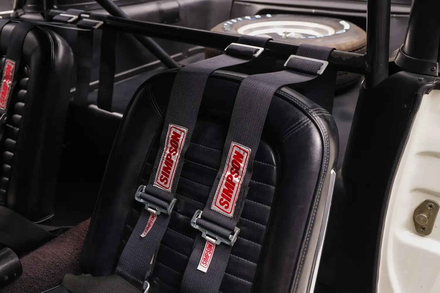 Exterior and Interior: The exterior of this Mustang features fiberglass R-style details at the front, along with distinctive side scoops and Plexiglass windows set in aluminum frames. The rear Plexiglass window is vented, and blanks have been fitted in place of the quarter windows, contributing to the car’s race-inspired appearance. The Wimbledon White paintwork is accented by striking blue Le Mans stripes that run the length of the car. Inside, the rear seat has been replaced with a practical parcel tray and a spare tire. A roll bar has been installed for added safety and structural integrity, and the bucket seats are equipped with Simpson harnesses, further emphasizing the car’s performance orientation. The heater and radio have been removed to save weight and focus on performance. Fiberglass and aluminum interior panels have also been installed. A Lecarra steering wheel frames modern gauges, providing accurate and easy-to-read information. The odometer shows approximately 8,800 miles, believed to represent the distance driven over the last 24 years since the build. A Fuel Safe fuel cell is mounted in the trunk, along with the battery.