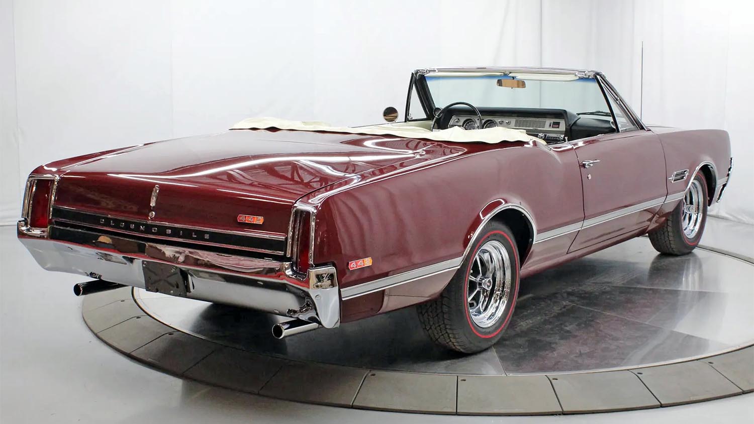 The visual character of this 1966 Oldsmobile 442 convertible is defined by its professional respray in factory-correct Burgundy Mist (Code N). The finish is reportedly free of imperfections, highlighting the crisp lines and subtle coke-bottle contours of the Oldsmobile sheetmetal. The car’s stance is enhanced by upsized 15-inch Super Stock I wheels wrapped in 225/70R15 BFGoodrich redline radials, perfectly bridging the gap between period-correct aesthetics and modern road manners. Brightwork remains polished, and the power-retractable top offers a seamless transition from a formal coupe profile to a dedicated open-air cruiser.