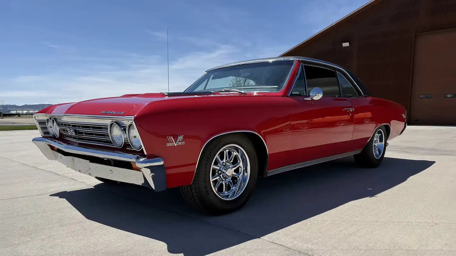 The 1967 Chevrolet Chevelle stands as an icon of the muscle car era, renowned for its potent engine options and stylish design. This particular Chevelle coupe is a prime example, boasting a formidable 454 CI V-8 big block engine paired with a desirable Muncie 4-speed manual transmission. Finished in eye-catching Bolero Red with a sleek black interior and equipped with factory air conditioning, this Chevelle offers a thrilling blend of performance and classic appeal.