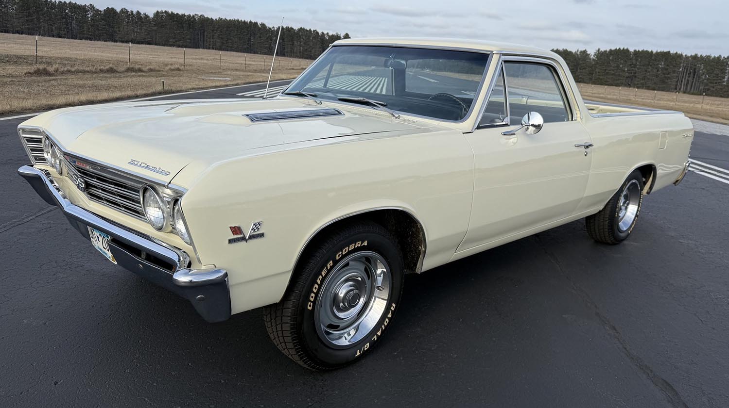 The exterior of this El Camino is refinished in a smooth cream, moving away from its original factory Granada Gold for a more subtle, custom appearance. The 1967 model year is distinguished by its refined horizontal-bar grille and quad headlight arrangement, which are accented here by SS and quarter-panel badging. Chrome bumpers and trim provide a bright contrast against the paint, while the drop-down tailgate retains its full functional utility. The truck rides on classic 15-inch Rallye wheels wrapped in 215/65 Cooper Cobra tires, creating a muscular stance that is quintessential for a mid-sixties Chevrolet. While the body presents well, the seller notes minor paint blemishes that are documented in the accompanying gallery.