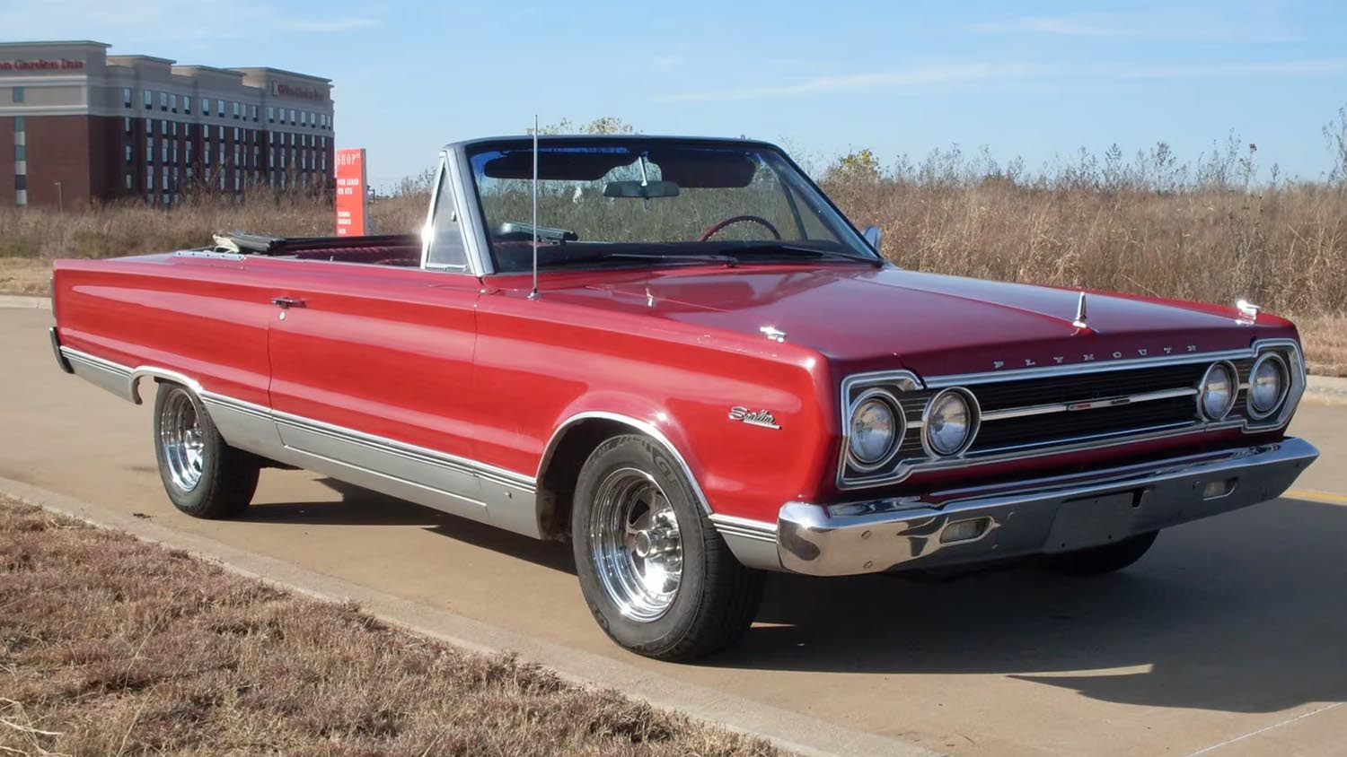 The visual impact of this 1967 Plymouth Satellite Convertible is undeniable thanks to its bold color scheme. Finished in a deep red, the exterior paint highlights the crisp lines and subtle chrome trim of the Satellite body. Inside, the cabin features a redone red interior that mirrors the factory specifications from 1967. The seats and door panels were meticulously handled during the refurbishment to ensure a period-correct feel. Consequently, sitting behind the wheel feels like stepping back into a classic American showroom. This monochromatic look was a popular and aggressive choice for high-performance Plymouth buyers.