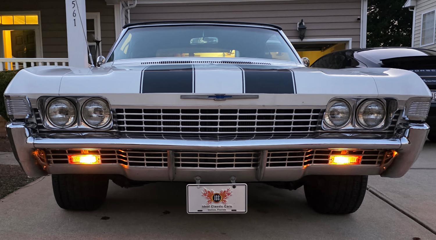 The exterior of the 1968 Chevrolet Impala Convertible stays true to its heritage while adding aggressive visual touches. Black stripes on the hood and trunk contrast sharply against the bright white paintwork. Quad headlights and gleaming chrome bumpers maintain the prestigious look that defined the Impala line. A black vinyl boot cover keeps the top tidy when lowered for those perfect sunny afternoon drives. The overall aesthetic is one of clean, powerful elegance that stands out in any classic car gathering.