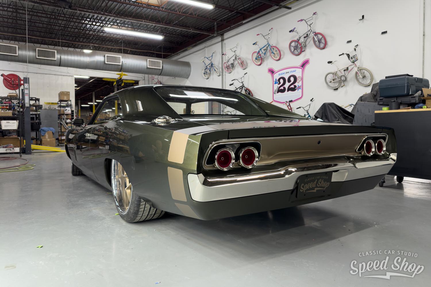 The Charger rides on a custom Roadster Shop “Fast Track” chassis engineered for precision and performance. Its wheelbase has been stretched forward by four inches to achieve a more aggressive stance and better balance. RideTech coilovers ensure responsive handling, while massive 6-piston Baer brakes provide powerful, fade-free stopping. Completing the package are Billet Specialties wheels, enhancing both aesthetics and grip.
