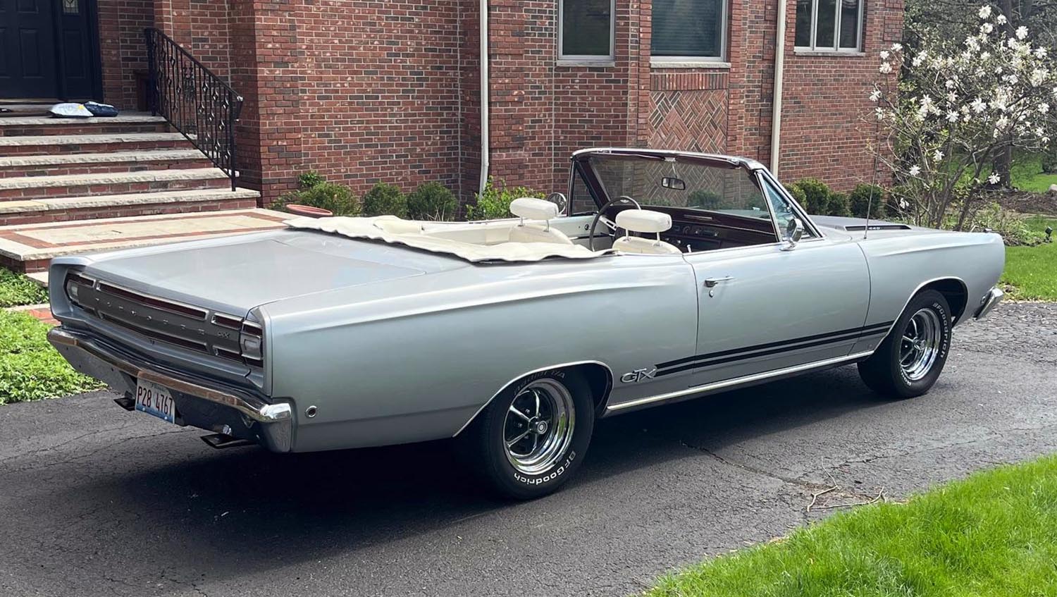 The exterior of this GTX is finished in its factory-correct Buffed Silver, a sophisticated shade that highlights the sharpened “Coke-bottle” silhouette introduced for the 1968 model year. Functional and aesthetic features include a replacement power-operated black soft top, quad headlights, and dual exhaust outlets that exit cleanly below the chrome rear bumper. Black horizontal sport stripes provide a sharp visual contrast, while 14-inch chromed steel road wheels mounted with BFGoodrich Radial T/A tires maintain a period-correct muscular stance. Fender-mounted turn signal indicators and bright wheel lip moldings further emphasize the premium positioning of the GTX trim.