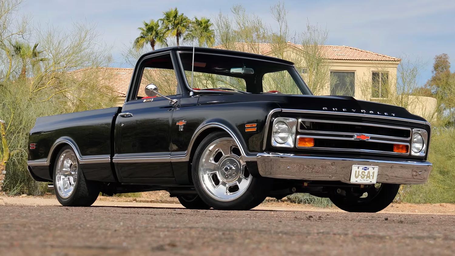 The truck sits perfectly on 20-inch Halibrand polished Sprint wheels, giving it a modern and aggressive stance. Toyo Proxes tires provide the necessary grip to handle the increased power from the LS V-8 engine. Power steering and a tilt steering column make maneuvering the large pickup an effortless task. The fuel tank was relocated under the bed for better weight distribution and safety.
