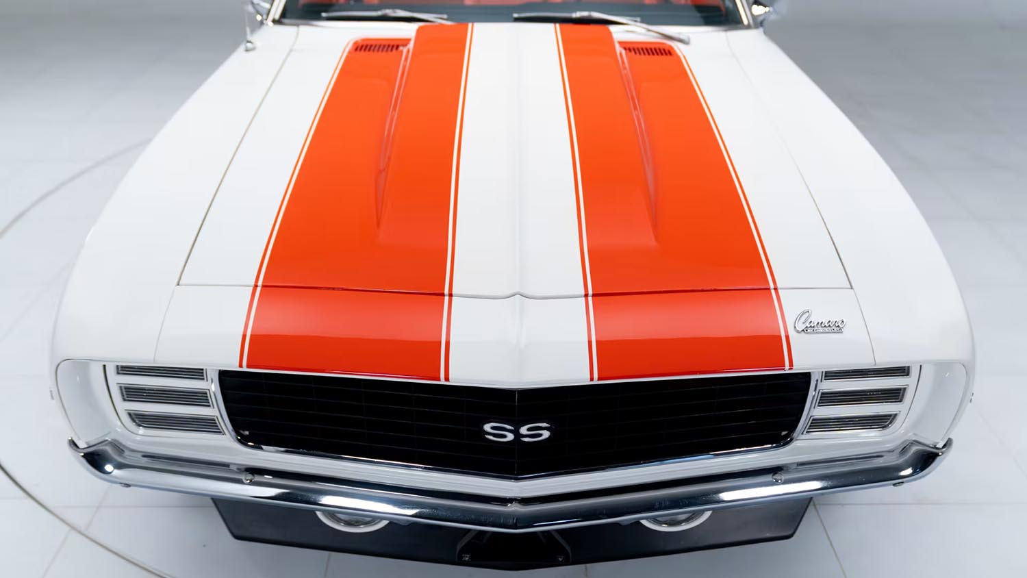The 1969 Chevrolet Camaro RS/SS Pace Car Convertible combines Dover White paint, Hugger Orange interior, and Z11 Pace Car details. Its 396 V-8 and 4-speed manual transmission highlight Chevrolet’s muscle era. Crossing the block in Kissimmee, it stands as a compelling piece of Camaro history.