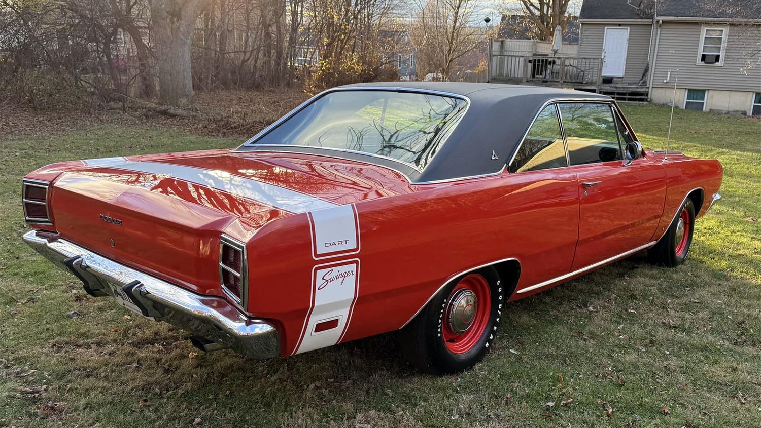 The exterior silhouette of this Dart is characterized by “arrow straight” body panels and a single high-quality repaint in its factory-original Charger Red (code R4). Iconic Swinger elements remain prominently displayed, including the signature white bumblebee tail stripe on the quarter panels and factory “power bulges” on the hood. A black vinyl roof provides a sophisticated contrast to the vibrant red paint, while the rolling stock consists of body-colored steel wheels with “dog dish” hubcaps wrapped in Goodyear Polyglas tires. All body panels are reported to be original, preserving the crisp lines and muscle-bound proportions that defined Dodge’s 1969 styling language.