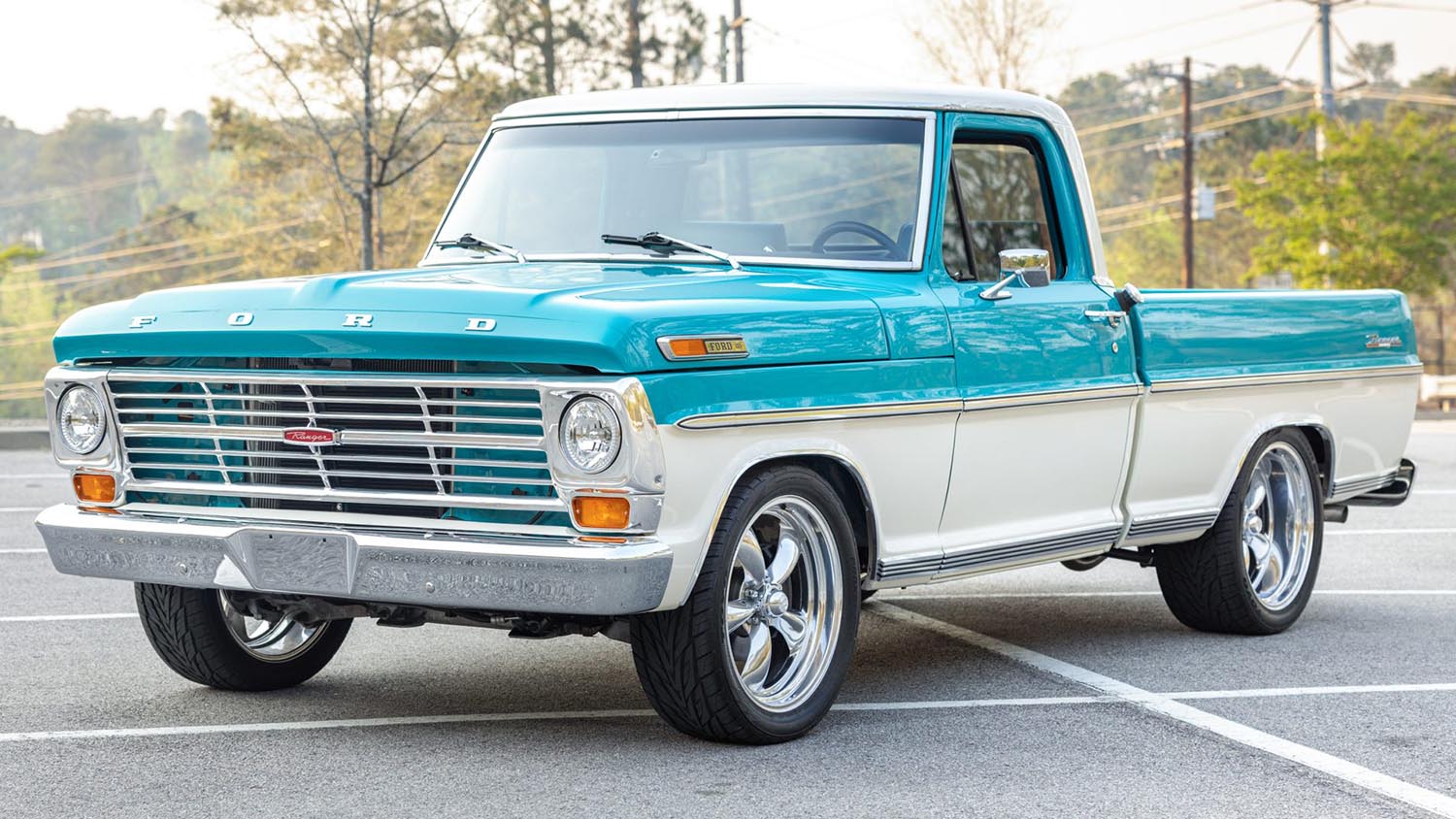 The exterior of this 1969 Ford F-100 Ranger is a striking example of the Styleside body, freshly repainted in a vibrant Swiss Aqua and Wilmington White combination. Under current ownership, the truck received new trim, LED headlights, and chrome bumpers to sharpen its visual presence. The classic silhouette is modernly grounded by 20-inch American Racing wheels wrapped in staggered Toyo Proxes ST tires. Practical details like dual side mirrors, ribbed rocker panels, and functional vent windows ensure the truck retains its utility-focused identity while standing out as a high-tier custom build.