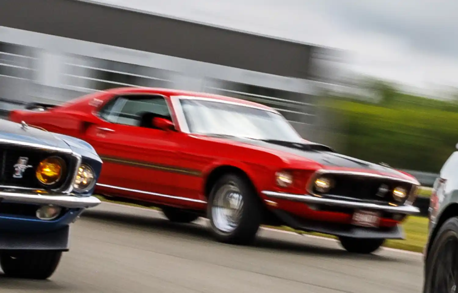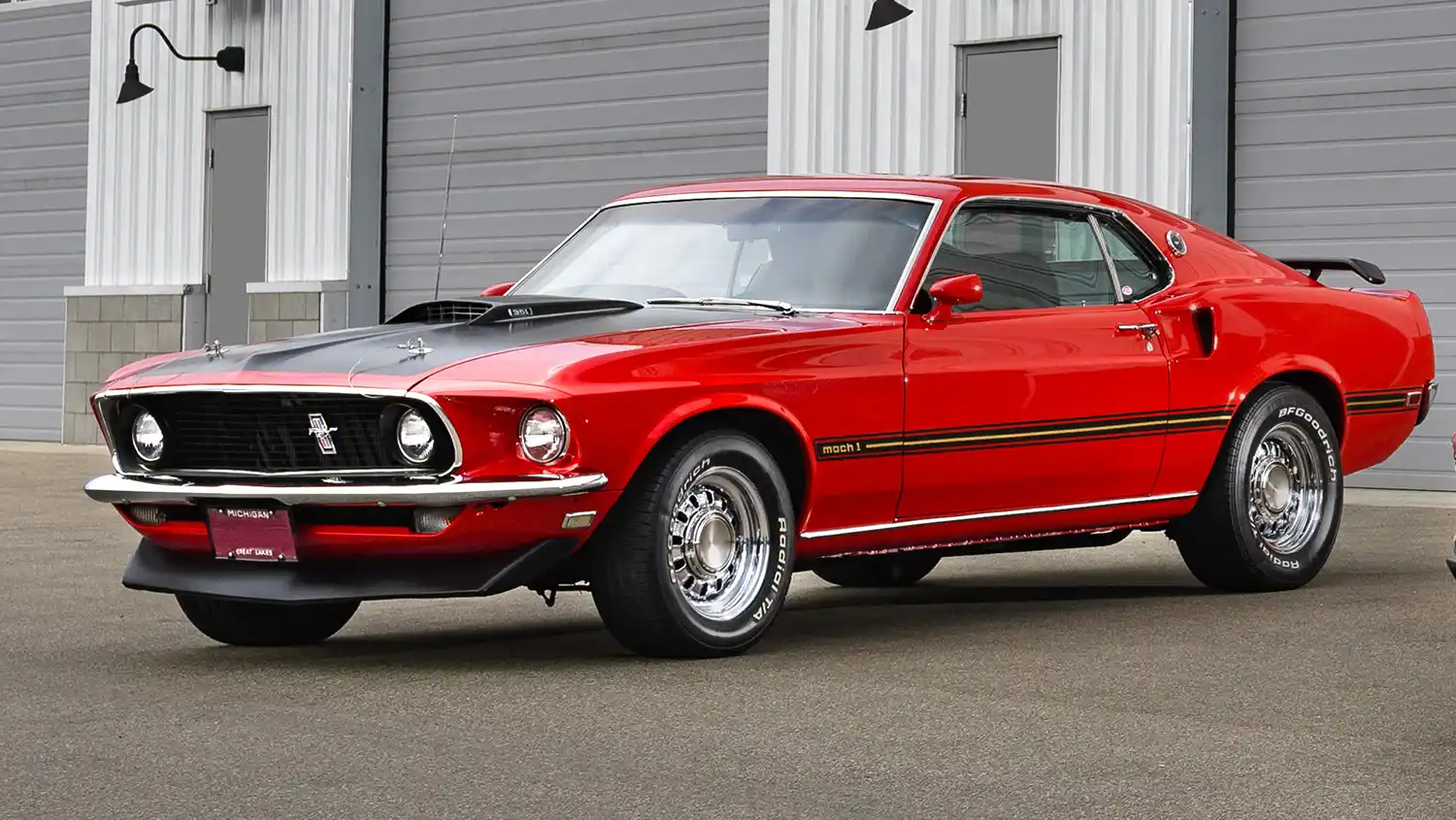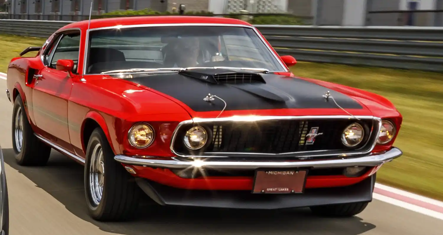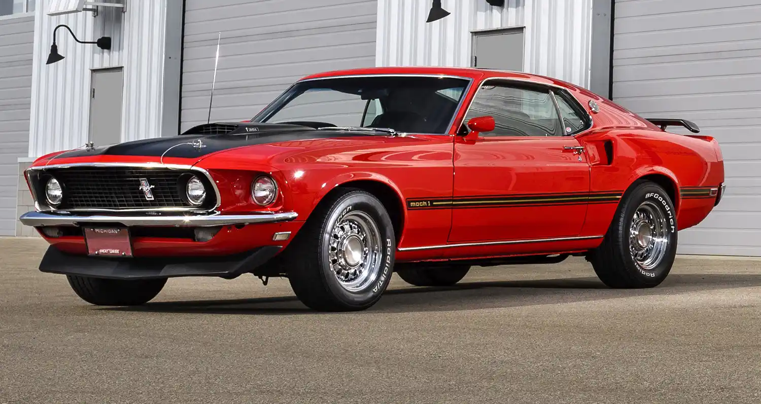 The 1969 model year saw the introduction of the Mach 1, with a variety of powerplants options and many new styling and performance features. Distinctive reflective striping was placed along the body sides, with a pop-open gas cap, dual exhausts, matte-black hood with simulated air scoop and NASCAR-style cable and pin tiedowns. It used steel wheels with bold-lettered Goodyear Polyglas tires. A functional “shaker” hood scoop – which visibly vibrated by being attached directly to the air cleaner through a hole in the hood – was available, as were tail-mounted wing and chin spoilers and rear window louvered blackout shade. The Mach 1 featured a deluxe interior with simulated wood trim, high backed seats, extra sound deadening, remote sports mirrors and other comforts. The Mach 1 proved popular with buyers with 72,458 cars sold through 1969.