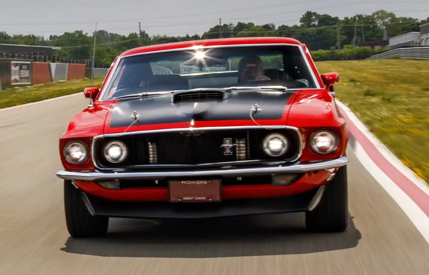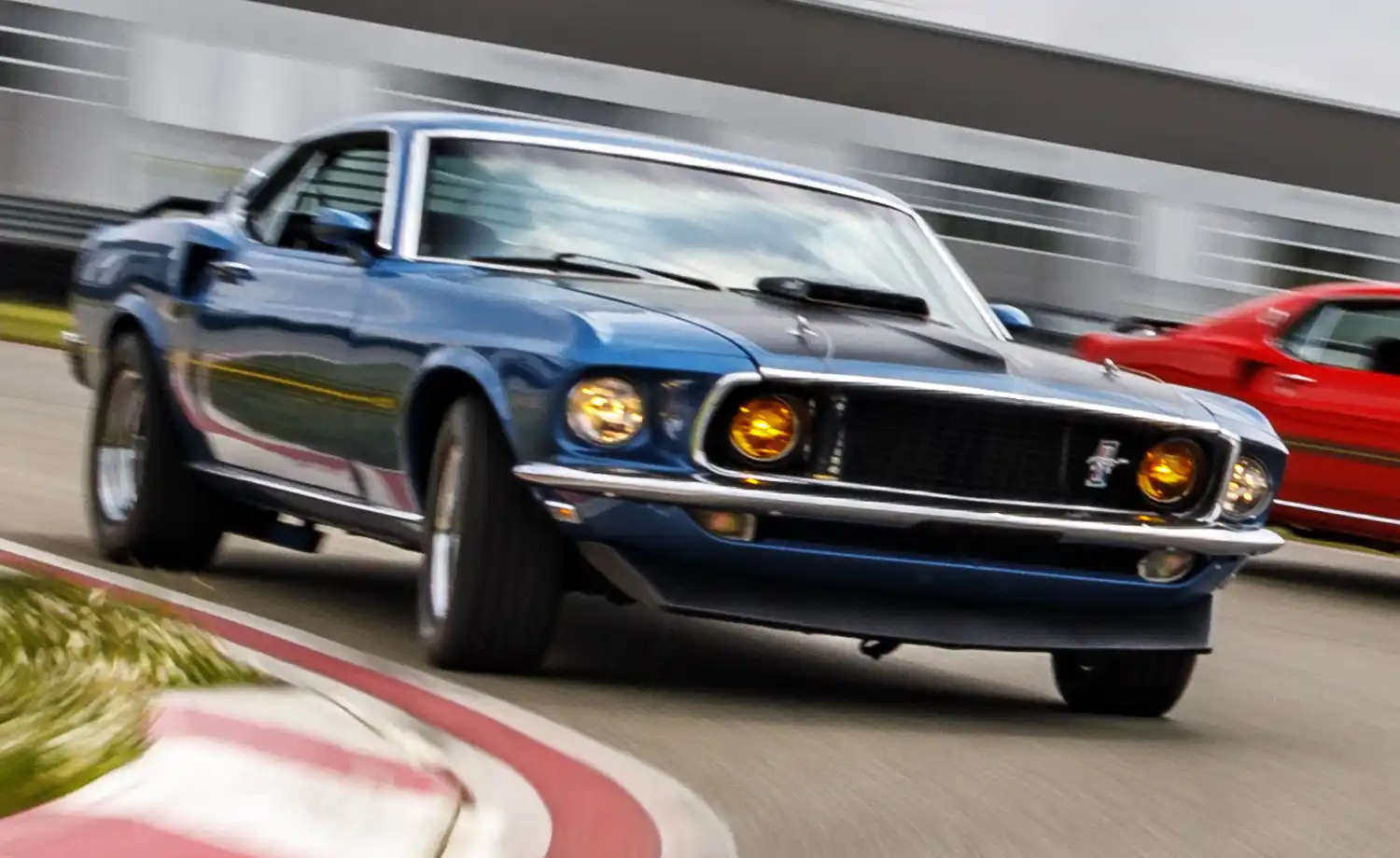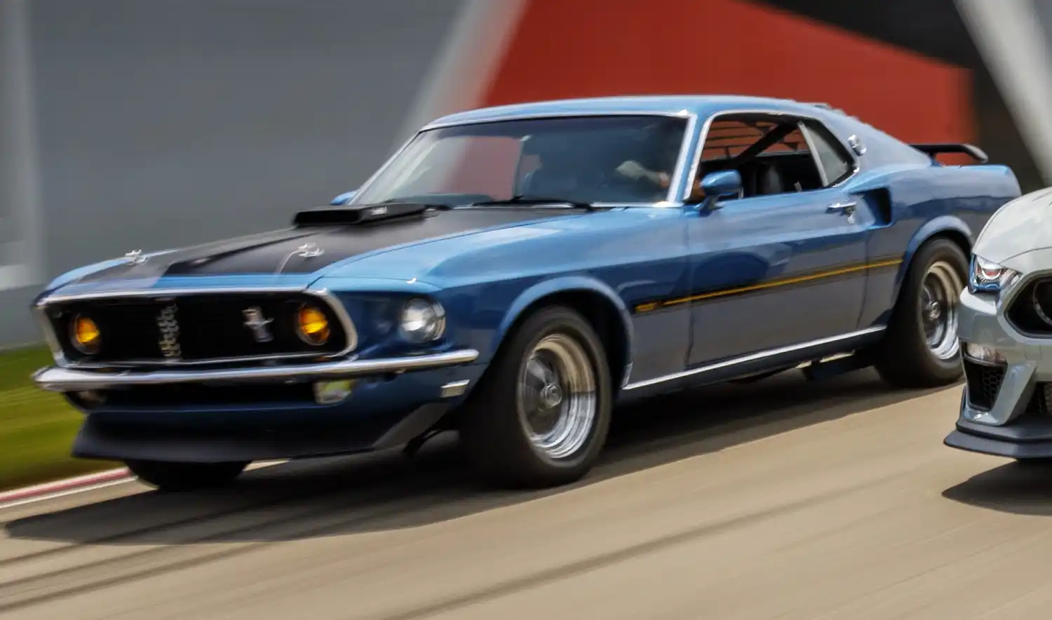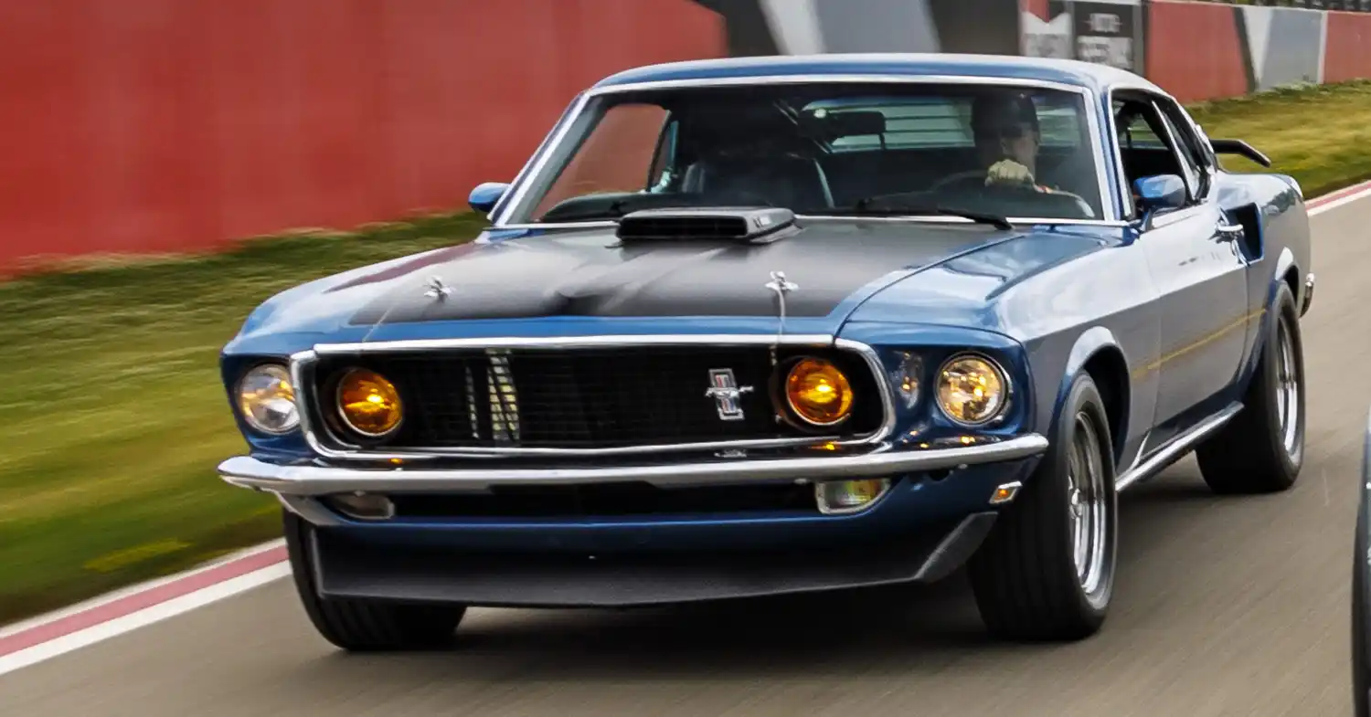 The 1969 model year restyle “added more heft to the body” with body length extended by 3.8 inches (97 mm) (the wheelbase remaining at 108 inches), width increased by almost half an inch, and the Mustang’s “weight went up markedly too”. 1969 was the first model to use quad headlamps placed both inside and outside the grille opening. The corralled grille pony was replaced with the pony and tribars logo, set off-center to the drivers side. The car was longer than previous models and sported convex rather than concave side panels. The fastback body version was renamed Sportsroof, styled as SportsRoof in Ford’s literature.