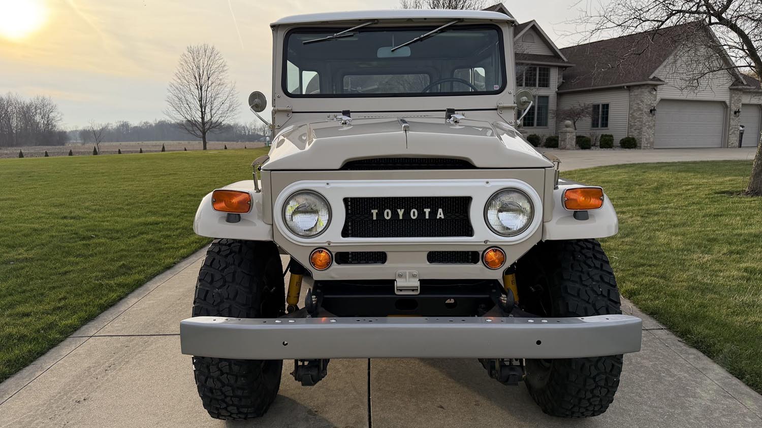 The exterior of this FJ40 is finished in a timeless Beige with a contrasting white roof, a color scheme that emphasizes its boxy, functional silhouette. During the 2016 refurbishment, the body seals were replaced to ensure weather-tight integrity, and a white-finished grille bezel was installed to complete the classic Toyota face. The truck features a removable hardtop, dual side mirrors, and rear bumperettes, while the 15-inch steel wheels are wrapped in aggressive 33-inch BFGoodrich Mud-Terrain T/A KM2 tires. A full-size spare is mounted on a swing-away rear carrier, underscoring its readiness for adventure. While the paint presents well, the seller notes minor imperfections including scuffs on the roof and typical corrosion near some hardware points.